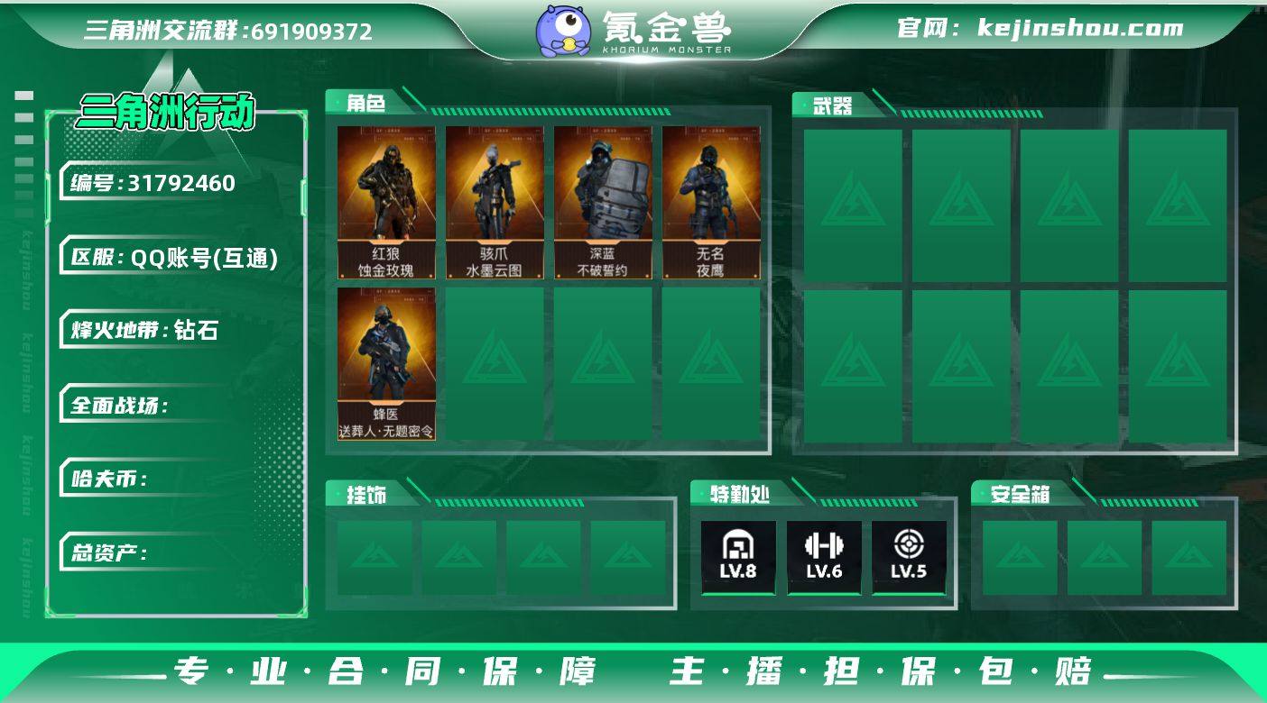 1161/三角洲qq/资产141M/烽火等级60/红狼蚀金玫瑰+水墨云图+不破誓约+送葬人+夜鹰/高特勤4满级+部门22322+冰龙/收藏室23M+红弹+刘涛/鹅鹅杀捆绑包/4赛季巅峰战神+彦祖分祖+守信不渝/