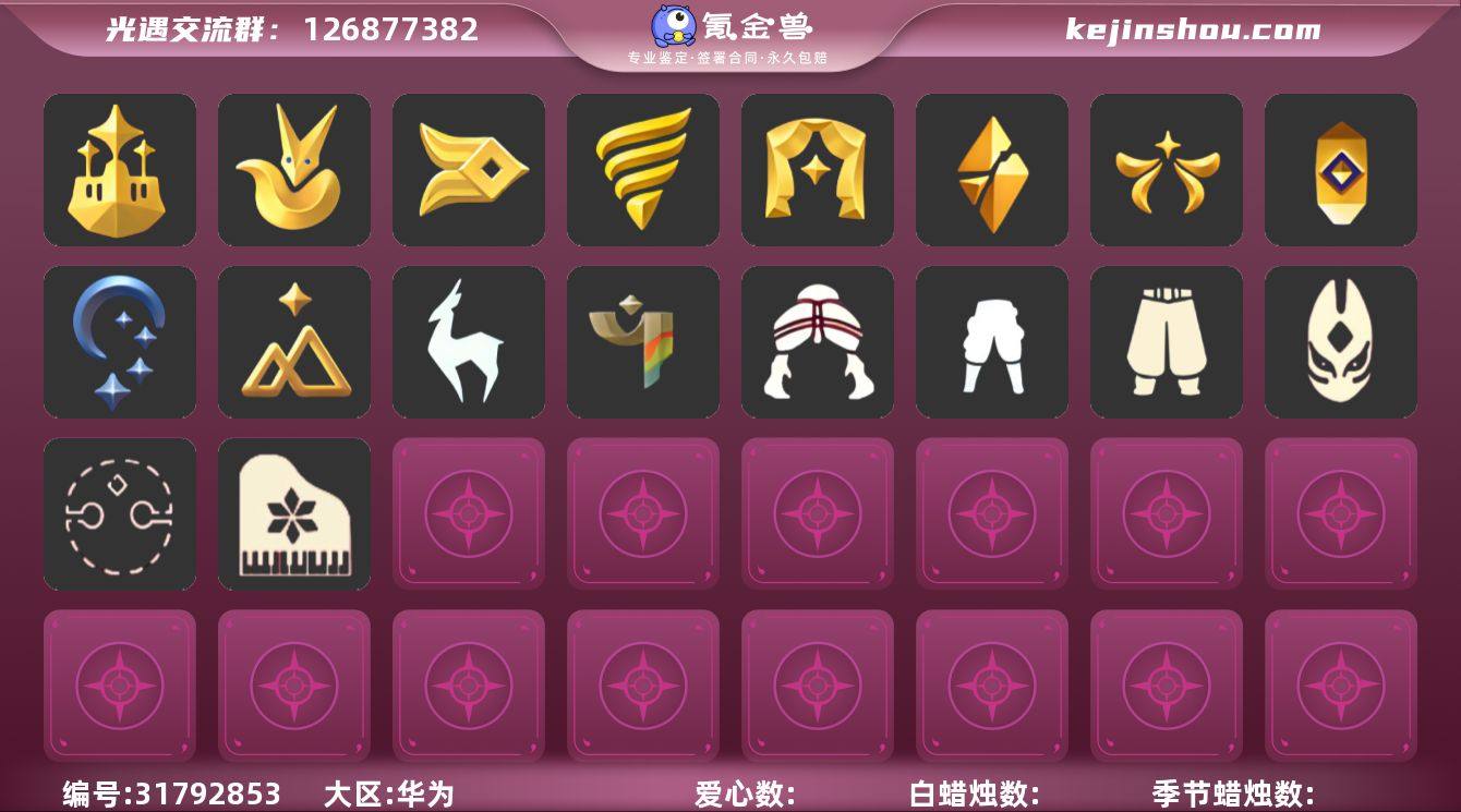账号类型: 手机账号 季节已毕业: 梦想季,小王子季,风行季,潜海季,表演季,破晓季,欧若拉季,集结季,夜行季,追忆季 完成地图: 晨岛,云野,雨林,霞谷,暮土,禁阁 珍稀物品: 白枭,透明蝶翼斗,玫瑰花 礼包: 巫师,围巾,欧若拉之翼,莲花斗,鹿角,蜘蛛斗,兔子鞋,秋千,白绒金,瑞雪,福娃,灯笼,人声乐器,彩虹帽,雪花球,橘子,贝壳,红伞,兔子,南瓜,雪花,水母,猫套,星月头饰,彩虹耳钉,彩虹耳机,新年裤,蝴蝶结,拖鞋,滑板,日光耳环,遥鲲披肩斗篷,活力海牛礼包 裤子: 武士裤,背带裤,搓澡巾,王子服,蓝绿裤,风行毕业裤子 面具: 凤凰面具,呼吸面具,夜行毕业面具,黄眉企鹅面具 面饰: 红耳机 项链: 围巾 发型: 若笠,虚荣,单侧绑发,小王子发型,留辫蘑菇头 头饰: 行军锅头盔,羽毛发饰,蓝色音乐会 斗篷: 海洋斗,蟑螂斗,绿芽,粉红绒毛斗篷,遥鲲斗篷,黄色连帽披风,燕尾斗篷,冥龙斗篷,领主红斗篷,瑞雪斗篷 配饰: 雨伞,高音钢琴,玫瑰花,鲲灯 亮点: 【优质装备】:表演季,白枭(帝企鹅发),武士裤,梦想季,小王子季(王子季),风行季,潜海季,破晓季,透明蝶翼斗,欧若拉季(欧若拉),行军锅头盔(六边锅帽子)(双耳锅帽子),羽毛发饰(多羽发饰),高音钢琴(白色高脚钢琴),集结季,玫瑰花,夜行季,追忆季,王子服(小王子套装),蓝绿裤(高领舞服),蟑螂斗(凤凰斗篷),围巾(肩带),风行毕业裤子(羽袖长袍),凤凰面具,呼吸面具(潜水面具),夜行毕业面具(棕熊面具),黄眉企鹅面具,单侧绑发(单边小辫),小王子发型,留辫蘑菇头,粉红绒毛斗篷(绒毛斗篷),遥鲲斗篷(双翼遥鲲斗),黄色连帽披风(连帽斗篷)(斜边队长斗篷),燕尾斗篷,冥龙斗篷,领主红斗篷(暗红斗篷),鲲灯(追忆之书),欧若拉之翼,福娃(福娃礼包)(春之日礼包)(铜钱斗),莲花斗(异彩莲花斗篷),秋千(情人秋千),猫套(皮皮猫斗)(皮皮猫礼包),红耳机,围巾(小王子斗篷)(小王子围巾),鹿角(圣诞鹿角),蜘蛛斗(蛛丝斗篷)(蛛网斗篷),瑞雪(瑞雪斗...