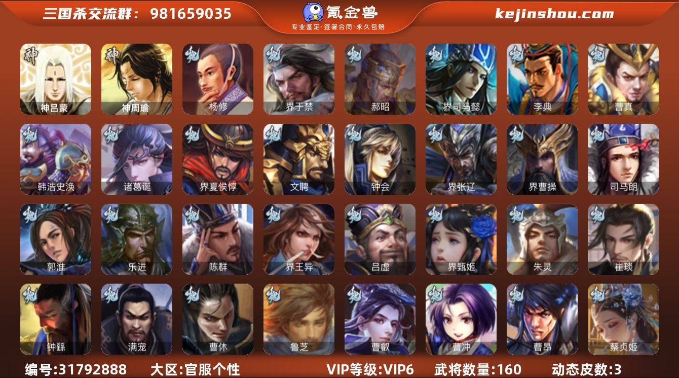 【14789214】官阶:先锋将军;VIP等级:VIP6;史诗武将数量:7;动态皮肤数量:3;武将总数:160;史诗宝珠数量:0;将魂数量:0;神将:0;魏国史诗武将:0;蜀国史诗武将:2;吴国史诗武将:0;群史诗武将:2