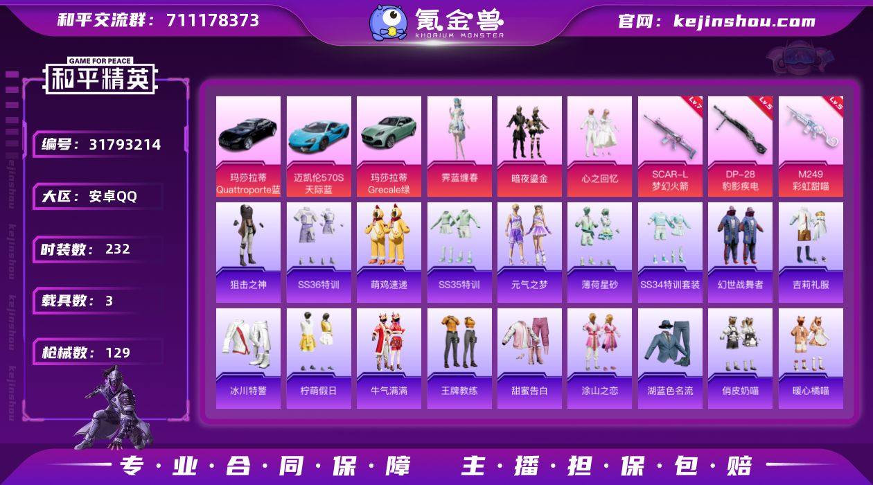 实名: 可修改 时装数: 232 载具数: 3 枪械数: 129 战备数: 75 热门装扮: 暗夜鎏金,心之回忆,霁蓝缠春 载具: 玛莎拉蒂Grecale(薄荷绿),玛莎拉蒂Quattroporte(夜幕蓝),迈凯伦570S(天际蓝) 稀有枪皮: SCAR-L梦幻火箭,M249彩虹甜喵,DP-28-豹影疾电