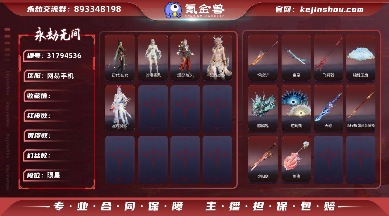 WJ2733,网易手机,12月18日可换绑,三人段位陨星3,15红,460金,御祥云,剪纸彩刀,麒麟魄,少阳剑,帝星,悍虎斩,飞将戟,如意金箍棒,天琼,锦鲤玉扇,逆晦朔,初代玄女,星辉魔纱,熛怒炼火,泣珠龙纱,沙漠香风,墨离,至纯,过江龙,午后瑰夏,盛夏白阳,天狐,亢龙,数珠丸,劫涛潮,学宫之杖,夜华朝,云溪仙子,九骊之君,萍之缘,唐三,信手斩龙,星空投影,龙吉公主,秋神蓐收,夜绸袍,暖冬茶馨,木棉,活动中心手机绑定无法解绑,找回包赔,