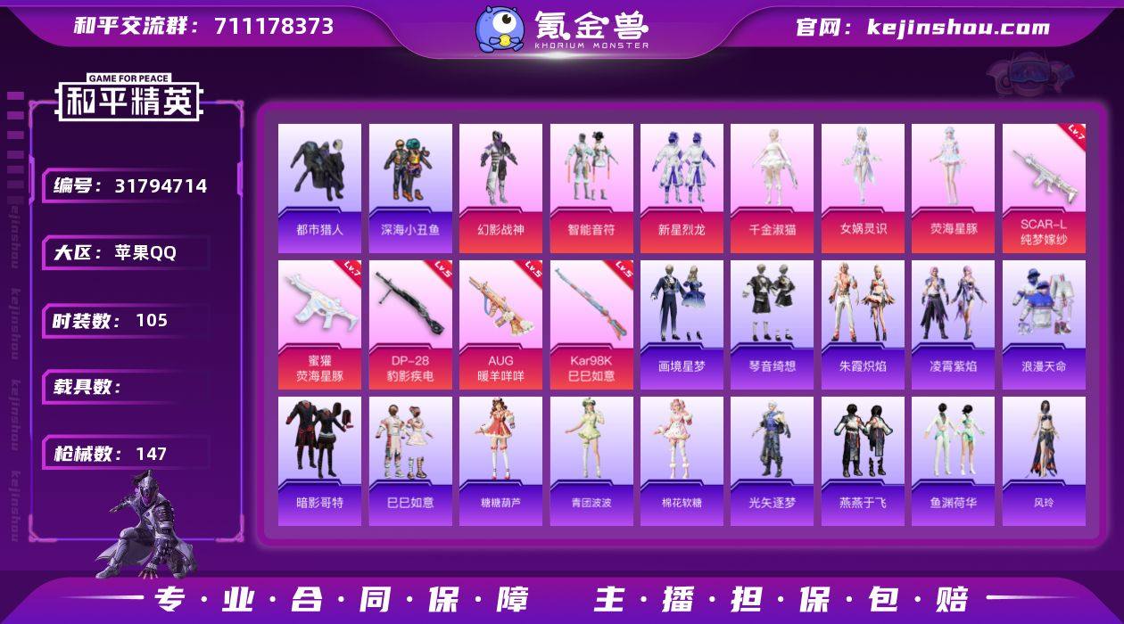 "DAS9889 -可二次 苹果Q-2稀有7粉装5特效枪5热门105套装147枪皮 43984热力值 6印记 历史无敌战神 Ss23战神框 都市猎人 暗影哥特 浪漫天命 满级 SCAR-L-纯梦嫁纱 (7级) 蜜獾-荧海星豚 (7级) 【2稀有】 都市猎人 浪漫天命 【7粉装】 女娲灵识 时空协奏和音 千金淑猫 荧海星豚 幻影战神 智能音符 新星烈龙 【5特效枪】 SCAR-L-纯梦嫁纱 (7级) Kar98K-巳巳如意 (5级) DP-28-豹影疾电 (5级) AUG-暖羊咩咩 (5级) 蜜獾-荧海星豚 (7级) 【5热门】 深海小丑鱼 暗影哥特 破蛋小黄鸡 极速红龙 AKM-奇异狩猎者 【2头盔】 梦幻火箭头盔 百万伏特头盔 【1背包】 梦幻火箭背包"