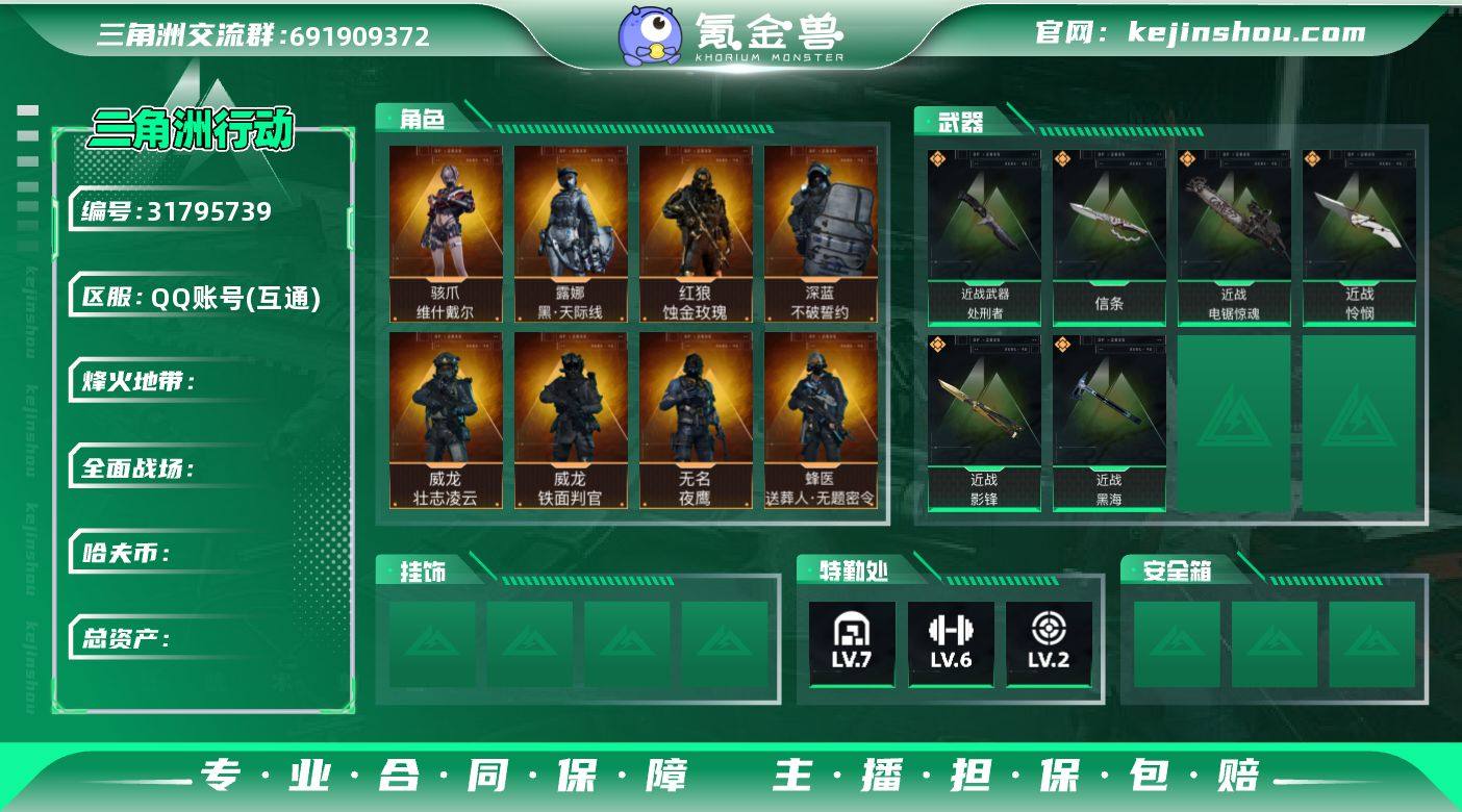 144m总资产-35974k哈伏币-60烽火等级-铂金-50战场等级-尉官 【干员外观】:红狼-蚀金玫瑰,露娜-黑·天际线,骇爪-维什戴尔,威龙-铁面判官,威龙-壮志凌云,蜂医-送葬人·无题密令,无名-夜鹰,深蓝-不破誓约 【近战皮肤】:近战-信条,近战-黑海,近战-影锋,近战-怜悯,近战-电锯惊魂,近战-处刑者,近战-黑鹰 【传说外观】:M4A1突击步枪-蚀金玫瑰,M4A1突击步枪-阿米娅,QBZ95-1突击步枪-破军,K416突击步枪-行动记录,SG552突击步枪-运动员,AK-12突击步枪-夜鹰,AK-12突击步枪-特斯拉线圈,SCAR-H战斗步枪-铁艺苍穹,SCAR-H战斗步枪-启航,G3战斗步枪-骑士,CAR-15突击步枪-黑鹰坠落,CAR-15突击步枪-阿米娅,AS Val突击步枪-蛇年祥瑞,腾龙突击步枪-捞点薯条,腾龙突击步枪-死神玫瑰,腾龙突击步枪-马年祥瑞,腾龙突击步枪-万金泪冠,MP5冲锋枪-黑海,P90冲锋枪-信条,UZI冲锋枪-特斯拉线圈,SMG-45冲锋枪-骑士,SR-3M紧凑突击步枪-特斯拉线圈,勇士冲锋枪-能天使-午夜邮差,勇士冲锋枪-万金泪冠,S12K霰弹枪-电锯惊魂,725双管霰弹枪-送葬人-无题密令,PKM通用机枪-钢铁意志,M250通用机枪-骑士之心,QJB201轻机枪-黑海,M14射手步枪-电锯惊魂,M14射手步枪-蛮荒,SR-25射手步枪-水墨云图,SR-25射手步枪-信条,R93狙击步枪-维什戴尔,AWM狙击步枪-捞点薯条,AWM狙击步枪-万金泪冠,G18-马年祥瑞,93R-捞点薯条,复合弓-黑·天际线.