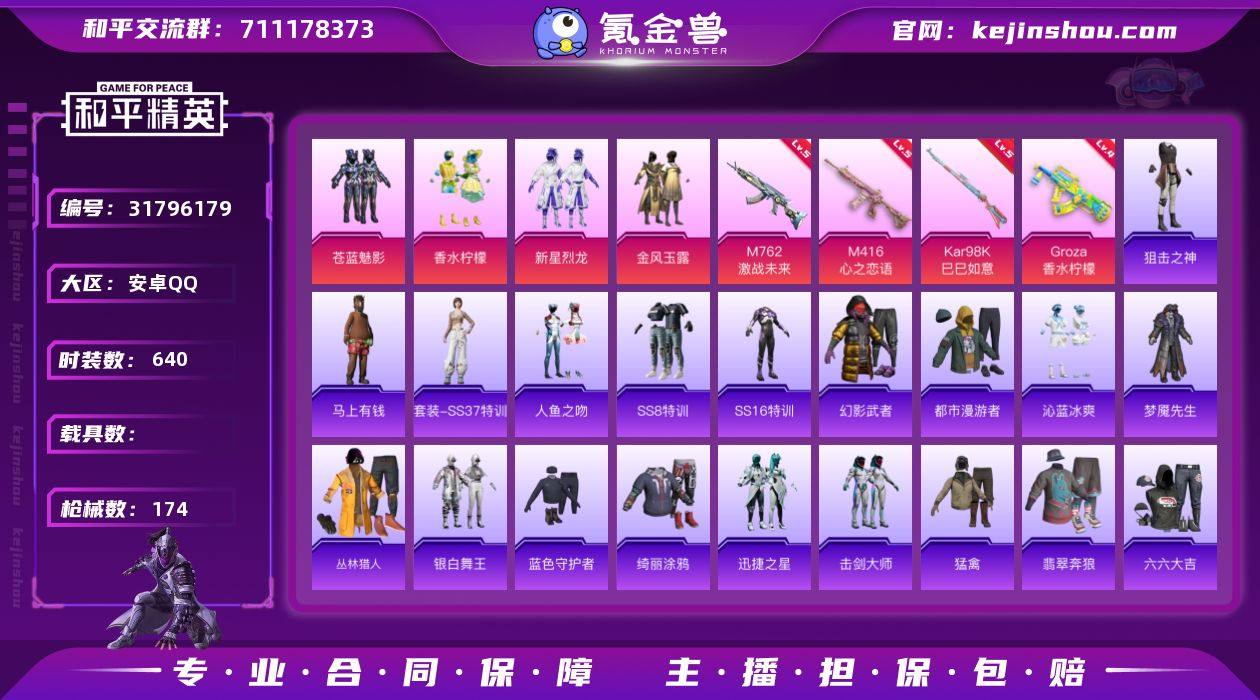 实名:不可二次实名 是否支持人脸包赔:支持 粉装数量:4 特效枪数量:4 时装数:640 枪械数:174 苍蓝魅影,金风玉露,香水柠檬,新星烈龙 五级Kar98K-巳巳如意,五级M416-心之恋语,五级M762-激战未来,四级Groza-香水柠檬 狙击之神,马上有钱,SS37特训,暗影哥特,冰川格斗者,冰川特警,缤纷果语,北国孤狼,滨海假日,白虎圣者,白色伏地魔,白熊同盟,长空猛禽,丛林猎人,潮流先锋,潮流炫酷,潮流游乐家,传奇侦探,春日漫步,炽焰拳师,大橘大利,都市漫游者,风暴特警,翡翠奔狼,飞驰魅影,风华少年志,疯狂小兔子,风行保卫者,福星高照,飞行日记,格斗专家,刚毅裁决者,虎虎生威吉莉,黑色刀锋,黑色伏地魔,黄色伏地魔,海上生明月,幻世战舞者,幻影武者,极地朋克,竞技达人朋克,击剑大师,竞技名士,竞技勇士朋克,吉莉礼服,静谧青瓷,坚韧舞者,精神漫游,决胜时刻,金鼠迎春,机械英豪,机械征服者,军械专家,酷潮明星,科技之星,凛冬战士,六六大吉,浪漫波比,镭射皇者,蓝色守护者,蓝色运动,龙腾端午,冷焰舞者,猛禽,萌黄之夏,魅力单车,麻辣教官,萌趣颜团子,迷域探索者,梦魇先生,逆风勇士,霓虹街区,牛气冲天,牛气满满,破蛋小黄鸡,PEL躁动竞梦者,朋克治安官,破晓战魂,青春冒险家,青春校园,拳皇97八神庵,沁蓝冰爽,绮丽涂鸦,千禧之恋,青羽突袭者,燃烧卡路里,热血青春,熔岩使者,人鱼之吻,圣诞大吉,圣殿骑士,闪金天王,深蓝冒险家,沙漠兵团,沙漠毒蛇,神秘领域,SS10特训,SS11特训,SS12特训,SS13特训,SS14特训,SS15特训,SS16特训,SS17特训,SS18特训,SS19特训,SS20特训,SS21特训,SS23特训,SS25特训,SS29特训,SS31特训套装,SS32特训套装,SS3特训,SS5特训,SS6特训,SS7特训,SS8特训,SS9特训,巳巳如意,甜蜜菠萝,甜蜜告白,甜蜜熊情侣,突袭者,特种颜团子,特战装甲,WiFi精灵,舞夜骑士,迅捷之星,夏日音浪,雪山精英,雪山征服者,星途旅人,核芯基因,银白舞王,迎春赐吉,原初圣火,跃动心情,耀粉歌者,摇滚狂鲨,雨林探路者,音速流光,玉兔迎春,野性战魂,野性战心,夜莺强袭者,耀眼新星,智慧之神,智谋强哥,众神之王,灼焰舞者,治愈之星 神秘黑猫飞行器,百万伏特降落伞,金风玉露降落伞,恐龙拽拽降落伞,PEL轰鸣竞梦者降落伞,四圣焕新降落伞,旋转彩虹降落伞,炫紫旋律降落伞,银刃赛罗降落伞 卖家说:急用钱,急出