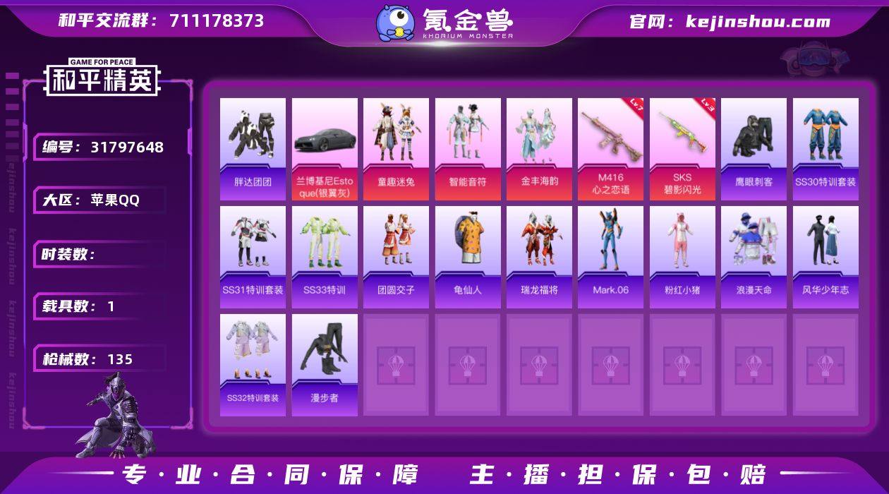 苹果Q 不可二次 M416-星际漫游 3粉套2特效1载具 43137热力值 12王牌印记 107套装135枪皮 兰博轿车灰色浪漫天命 金丰海韵 智能音符 童趣迷兔 M416-心之恋语7级 SKS-碧影闪光3级 机甲封神飞行器 Mark.06 龟仙人 鹰眼刺客 胖达团团 团圆交子 瑞龙福将 粉红小猪 漫步者 风华少年志 M416-快乐主宰 M762-瑞龙福将 深海小丑鱼背包 深海曼妙背包 和平精英账号