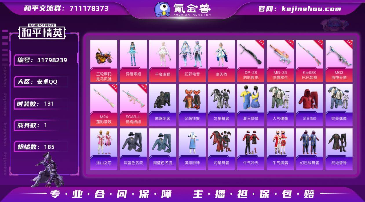 【洛天依5粉装6特效枪1载具可秒换绑】 安卓Q区-50751热力值-9印记-131套装-185枪皮 【1载具】 鬼马风驰【5粉装】 洛天依 幻影飞狐 幻彩电音 角色-千金淑猫 角色-异瞳寒姬【6特效枪】 M24-莲影清波(6级) SCAR-L-锦绣绵绵(5级) MG3-洛神天依(7级) Kar98K-巳巳如意(5级) DP-28-豹影疾电(5级) MG-36-沧焰双生(5级)【29热门】 M416-罗小黑 M416-蓝色火焰 长空猛禽 弄潮海豚 牛气冲天 霓虹街区 妙红点点 懵萌河马 浪漫天命 鹰眼刺客 破蛋小黄鸡 小丑鱼 白色伏地魔 SS27特训 SS26特训 SS25特训 SS24特训 SS22特训 Mk47-洛神天依 AWM-飒粉甜心 SCAR-L-玉兔迎春 M762-天降萌叽 Mk47-乌木金纹 SKS-糯团青竹 M249-彩虹符号 MG3-幻世战舞者 呆萌铁蟹【2飞行器】 粉色滑翔尾迹 火焰蝠人飞行服 营地ID:936980207