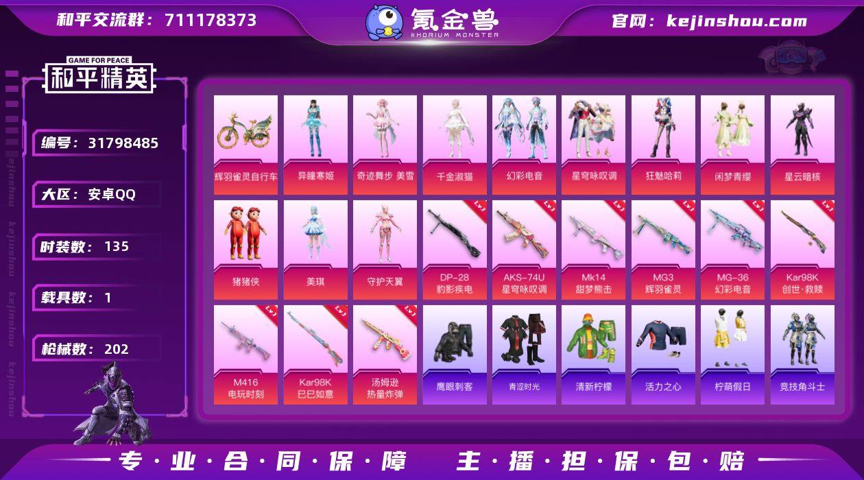 【11粉装9特效枪1载具可秒换绑】 安卓Q区-68217热力值-7印记-135套装-202枪皮 【1载具】 辉羽雀灵自行车【11粉装】 角色-美琪 玩偶服-猪猪侠 闲梦青缨 星云暗核 角色-守护天翼 星穹咏叹调 幻彩电音 角色-狂魅哈莉 角色-千金淑猫 角色-奇迹舞步 美雪 角色-异瞳寒姬【9特效枪】 M416-电玩时刻(5级) Mk14-甜梦熊击(5级) AKS-74U-星穹咏叹调(5级) Kar98K-创世·救赎(4级) MG3-辉羽雀灵(3级) MG-36-幻彩电音(5级) 汤姆逊-热量炸弹(5级) Kar98K-巳巳如意(5级) DP-28-豹影疾电(5级)【18热门】 长空猛禽 霓虹街区 懵萌河马 浪漫天命 雪山精英(老6服) 鹰眼刺客 破蛋小黄鸡 暗影哥特(红眼罩) 狂沙舞者 冰公主 TJB战队服 SS27特训 SS26特训 SS25特训 UMP45-蓝色火焰 M249-彩虹符号 MG3-幻世战舞者 AKM-星之彼岸【11飞行器】 齐天大圣飞行器 粉色滑翔尾迹 镜光幻境飞行翼 拂晓神骑飞行器 萌物绒绒飞行器 空岛之星尾迹 龙翔九天飞行器 绝色倾城飞行器 雀灵庇佑飞行器 终晖之翼飞行器 智趣喵喵飞行器 营地ID:953693573