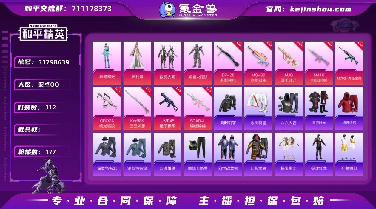 安卓 手Q-5粉装-2特效枪-1载具-1粉色飞行器-39038热力值-7王牌印记-126套装-115枪皮 【粉色套装】:粉装-恐龙拽拽,粉装-赤焰黑爵,粉装-紫电风暴,粉装-未来领航者,角色-异瞳寒姬 【粉色枪皮等级】:Kar98K-巳巳如意(五级),DP-28-豹影疾电(五级) 【粉色载具】:路特斯ELETRE(花绽灰) 【粉色枪皮】:Kar98K-巳巳如意,DP-28-豹影疾电 【粉色飞行器】:极意拳锋飞行器 【粉色降落伞】:银刃赛罗降落伞,蓝莓炮弹降落伞,天之羽翼降落伞,碧影闪光降落伞,青春物语降落伞,百合蜜语降落伞,恐龙拽拽降落伞,绯穹魔姬降落伞,极意拳锋降落伞 【稀有套装】:套装-巳巳如意,套装-雪国风尚,角色-都市丽猫,套装-星渊小夜曲,套装-彩虹兔,套装-云朵鹅,套装-雪绒豹,套装-蜜露汐语,套装-朱霞炽焰,套装-凌霄紫焰,套装-擎苍青焰 【稀有枪皮】:AKM-彩虹符号,AKM-恐龙拽拽,AKM-龙的传人,M16A4-蓝色火焰,SCAR-L-炫彩节奏,SCAR-L-玉兔迎春,SCAR-L-碧影闪光,SCAR-L-红色方程式,M416-糯团青竹,M416-红色方程式,M416-蓝色火焰,GROZA-异彩先驱,GROZA-恐龙拽拽,AUG-天降萌叽,AUG-耀粉歌者,QBZ-彩虹符号,QBZ-飞驰魅影,M762-橘柚倾心,M762-云朵鹅,G36C-冷魅冰骑,G36C-暗夜玫瑰,AC-VAL-天降萌叽,蜜獾-天降萌叽,蜜獾-娇憨猪猪,蜜獾-绯穹魔姬,ARX-凌霄紫焰,UZI-天降萌叽,UZI-娇憨猪猪,UMP45-夜灯,UMP45-生命誓言,汤姆逊-奇异狩猎者,汤姆逊-庄周梦蝶,汤姆逊-异彩先驱,汤姆逊-炫彩节奏,MP5K-异彩先驱,JS9-凌霄紫焰,P90-飞驰魅影,P90-巳巳如意,Kar98K-彩虹符号,Kar98K-炫彩节奏,Kar98K-飞驰魅影,M24-百合蜜语,AWM-垂柳戏鸭,AWM-庄周梦蝶,AWM-恐龙拽拽,VSS-碧影闪光,Mini14-异彩先驱,Mini14-梦幻火箭,Mini14-绯穹魔姬,SLR-娇憨猪猪,SVD-云朵鹅,S686-彩虹符号,S686-生命誓言,...