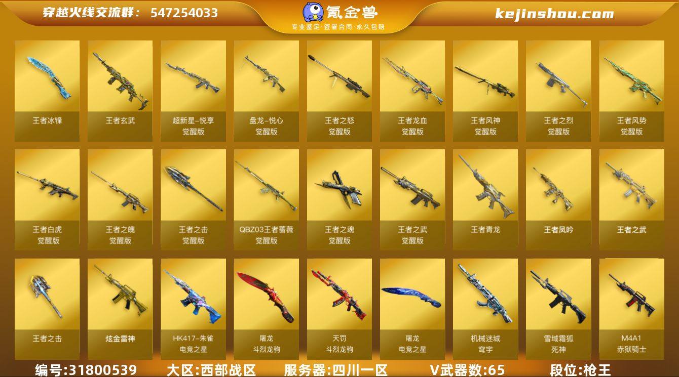 段位:枪王 VIP等级:VIP5 V武器数:65 王者武器数:22 炫金武器数:1 王者冰锋,王者玄武,超新星-悦享-觉醒版,盘龙-悦心-觉醒版,王者之怒-觉醒版,王者龙血-觉醒版,王者风神-觉醒版,王者之烈-觉醒版,王者风势-觉醒版,王者白虎-觉醒版,王者之魄-觉醒版,王者之击-觉醒版,QBZ-03-王者蔷薇-觉醒版,王者之魂-觉醒版,王者之武-觉醒版,王者青龙,王者凤吟,王者之武,王者之击 炫金雷神 HK417-朱雀-电竞之星,天罚-斗烈龙驹,屠龙-电竞之星,屠龙-斗烈龙驹,机械迷城-穹宇,死神-雪域霜狐,M4A1-赤狱骑士,AWM-昌龙,修罗-古蛇迷踪,金色蔷薇-古蛇迷踪,COP 357-幻灵,Glock18-武圣,AK47-黑武士-锦绣游龙,AK47-火麒麟,AK47-无影,AK47-黑鲨,AK47-黑武士,AK47-机械迷城,M4A1-雷神,M4A1-黑骑士,M4A1-死神,M4A1-黑龙,M4A1-青龙,M4A1-武圣,M4A1-幻灵,M4A1-玫瑰精灵,M200-幻神,Barrett-毁灭,Barrett-极光,AWM-天龙,Kar98k-星神,AA-12-雷霆,AK12-天启,QBZ03-金色蔷薇,屠龙,龙啸,麒麟刺,擎天,USP-雷暴,幻灵之锋,裁决,烈火-动感闪耀,天神-动感闪耀,屠龙-动感闪耀 传说星骇 王者-零-国色天香,王者凌霄,王者炫 斗烈龙骑,葵,灵动武士,兰-海滩派对,零·纪元,零-热舞青春,隼,雾萌萌,王者春,王者影豹,影豹,战地猎狐 HK417-朱雀-电竞之星-竞星跃动音效卡,屠龙-电竞之星-竞星跃动音效卡,死神-雪域霜狐-怀旧音效卡,烈火动感闪耀音效卡,天神动感闪耀音效卡,屠龙动感闪耀音效卡,AWM-裁决音效卡,Barrett-极光音效卡,Barrett-毁灭音效卡,M4A1-雷神音效卡