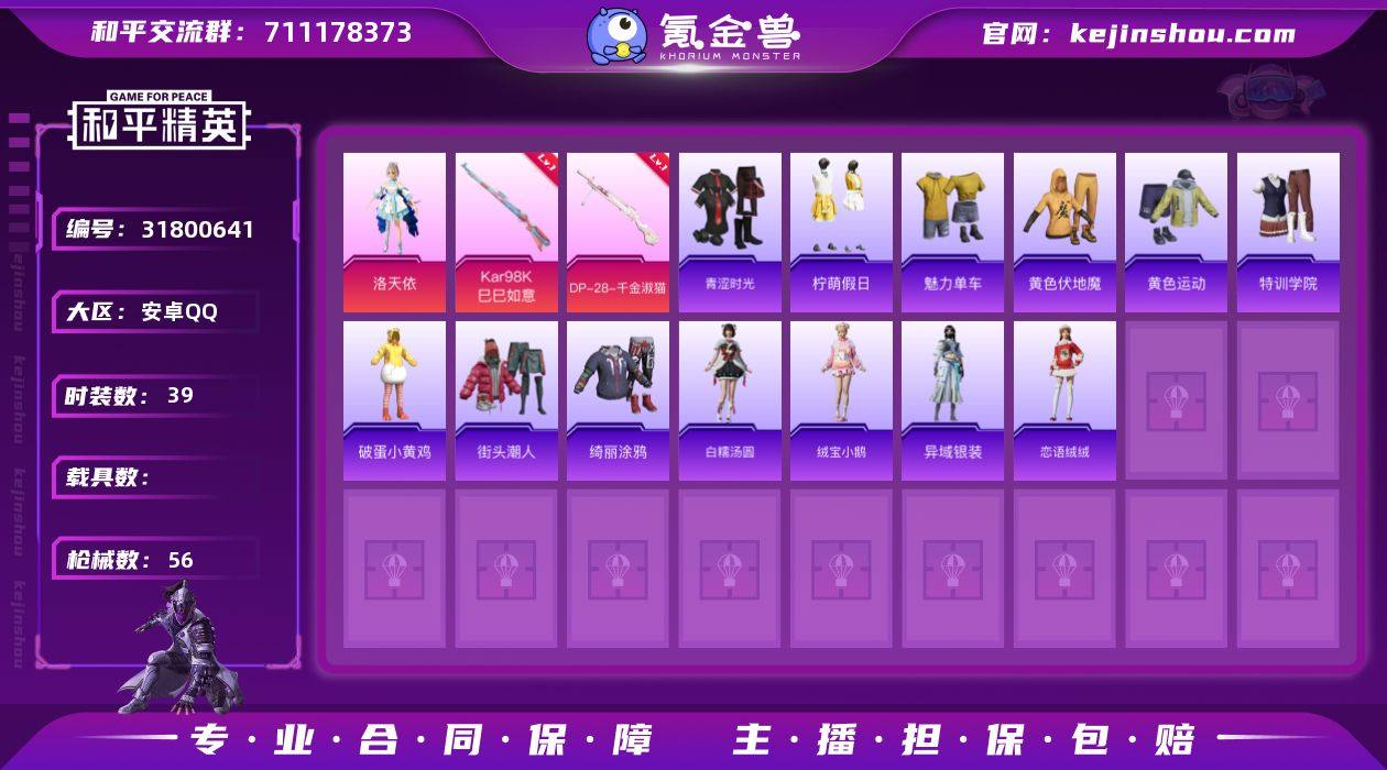 T271身法素材-1粉装角色洛天依-4特效枪Q16级-15105热力值-3王牌印记-39套装-56枪皮【优质套装】: 洛天依【特效枪等级】:DP-28-千金淑猫(三级- DP-28-千金淑猫)Kar98K-巳巳如意(四级- Kar98K-巳巳如意)【优质武器皮肤】: DP-28-千金淑猫 Kar98K-巳巳如意【稀有武器皮肤】: MG3-梦海之灵 DP-28-千金淑猫 Kar98K-巳巳如意 蜜獾-乌木金纹 PKM-啾咪啾咪 M416-红色方程式 AKM-破晓战魂 SCAR-L-红色方程式 M16A4-红色方程式 Kar98K-红色方程式 AWM-天降萌叽 SKS-炫彩节奏 Mini14-耀粉歌者 UZI-红色方程式 UZI-啾咪啾咪 UMP45-蓝色火焰 汤姆逊-耀粉歌者 S686-红色方程式 DBS-彩虹符号 MG3-幻世战舞者 AUG-异域银装 M200-乌木金纹 十字弩-异域银装【其他套装】: 洛天依 恋语绒绒 异域银装 白糯汤圆 绒宝小鹅 战术大师 特训学院 黄色运动 黄色伏地魔 街头潮人 魅力单车 青涩时光 破蛋小黄鸡 绮丽涂鸦 柠萌假日【优质飞行器】: 炫彩糖果飞行器 异域银装飞行器【优质降落伞】: 喜羊羊与灰太狼降落伞 霁蓝缠春降落伞 炫彩糖果降落伞 SS32王牌降落伞 普通降落伞 千金淑猫降落伞 白昼之火降落伞 异域银装降落伞 勇者同行降落伞