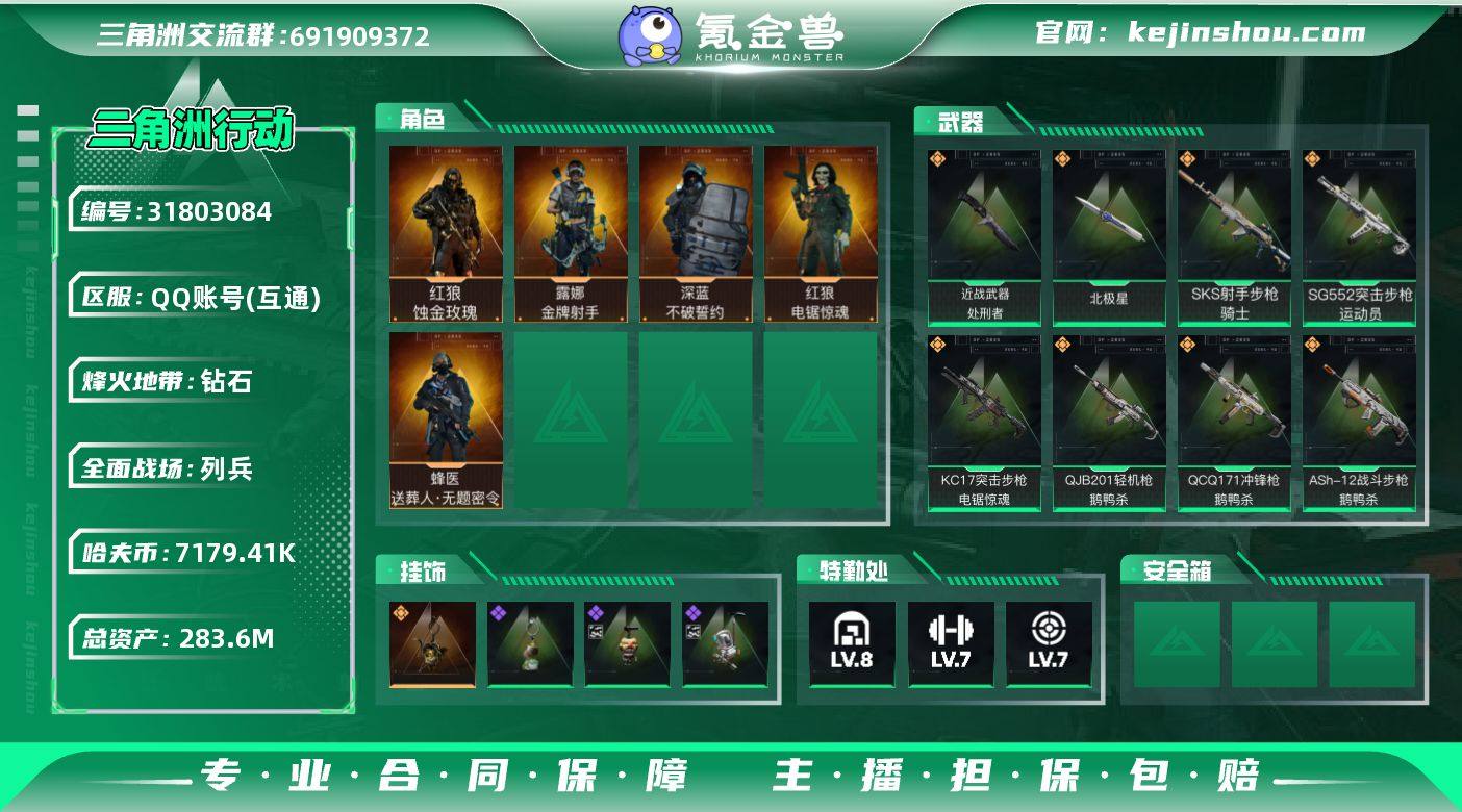 实名:可二次实名 总资产:283.6M 哈夫币:7179.41K 烽火地带段位:钻石 烽火地带等级:60 全面战场段位:列兵 全面战场等级:18 8级仓库,7级训练中心,7级靶场,6级指挥中心,3级潜水中心,3级防具台,3级工作台,3级制药台,3级技术中心,1级收藏室 战术部门等级:3 战斗部门等级:4 医疗部门等级:3 研发部门等级:3 后勤部门等级:3 曼德尔砖-气象感应:0 曼德尔砖-命运王牌:0 曼德尔砖-电玩高手:0 曼德尔砖-美杜莎:0