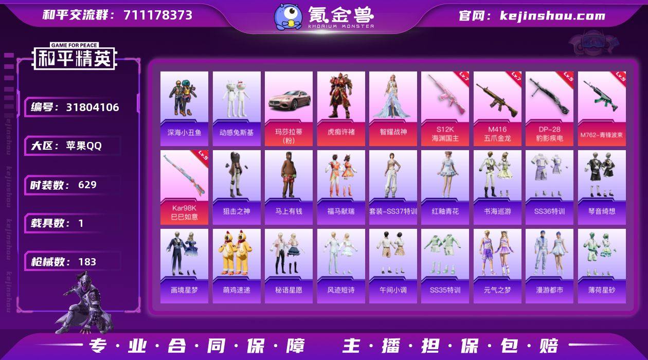 实名:不可二次实名 是否支持人脸包赔:支持 粉装数量:2 特效枪数量:5 载具数:1 时装数:629 枪械数:183 动感兔斯基,深海小丑鱼 虎痴许褚,智耀战神 七级M416-五爪金龙,七级S12K-海渊国主,五级DP-28-豹影疾电,五级Kar98K-巳巳如意,五级M762-青锋波束 玛莎拉蒂Ghibli(粉) 狙击之神,马上有钱,福马献瑞,红釉青花,SS37特训,雨过天青,画境星梦,琴音绮想,书海巡游,SS36特训,萌鸡速递,风迹短诗,秘语星愿,SS35特训,午间小调,元气之梦,漫游都市,薄荷星砂,云魄琉璃,凌霄紫焰,擎苍青焰,SS34特训套装,朱霞炽焰,暗影哥特,暗夜魅影,冰川特警,缤纷果语,暴风机械师,北国孤狼,滨海厨神,滨海假日,冰河战士,白色伏地魔,冰爽海盐,彩虹兔,雏菊兔兔,长空猛禽,潮流炫酷,顶瓜瓜,动感兔斯基,大橘大利,多纳泰罗,都市魅力,都市漫游者,风暴特警,飞驰魅影,粉恋花,福星高照,格斗先锋,龟仙人,刚毅裁决者,光之冒险,虎虎生威吉莉,湖蓝色名流,海琴烟,黑色伏地魔,黄色伏地魔,黄色名流,海上生明月,黄色运动,红色运动,幻影武者,捷德奥特曼,酒红色名流,橘黑制服,娇憨猪猪,竞技达人朋克,竞技名士,竞技勇士朋克,吉莉礼服,激萌罗小黑,坚韧舞者,极速红龙,街头潮人,蓝冰羽,蓝彩潮人,龙的传人,龙魂突击队,猎鹰,六六大吉,萝兰蝴蝶,浪漫假日,浪漫天命,蓝色运动,恋语绒绒,冷焰舞者,漫步者,摩登魅猫,猛禽,萌黄之夏,魅力单车,懵萌河马,萌趣咩咩,萌趣颜团子,梦魇先生,霓虹街区,柠萌假日,牛气冲天,牛气满满,破蛋小黄鸡,青春校园,绮丽涂鸦,青玉碎影,云朵鹅,瑞龙福将,荣耀,人气偶像,热血青春,深海小丑鱼,时空追击者,深蓝色名流,沙漠毒蛇,神气柴柴,SS12特训,SS14特训,SS15特训,SS16特训,SS17特训,SS18特训,SS19特训,SS20特训,SS21特训,SS22特训,SS23特训,SS24特训,SS25特训,SS26特训,SS27特训,SS28特训,SS29特训,SS31特训套装,SS32特训套装,SS33特训套装,甜蜜告白,涂山之恋,特训学院,团圆交子,特战装甲,完美偶像,王牌教练,迅捷狂鲨,炫蓝之夏,雪绒豹,旭日情侣,夏日音浪,雪兔飞飞,星途旅人,星渊小夜曲,跃动心情,耀粉歌者,音速流光,夜瞳黯灵,异域银装,战地督导,紫幽梦,灼焰舞者 极意拳锋飞行器,炫彩糖果飞行器,脆鲨七海飞行器,公主华盖飞行器,星之彼岸飞行器,异瞳寒姬降落伞,鬼刀降落伞,橘柚倾心降落伞,烈焰拳霸降落伞,圣堂之誓降落伞,未来战士降落伞,星穹咏叹调降落伞,筑梦精灵降落伞