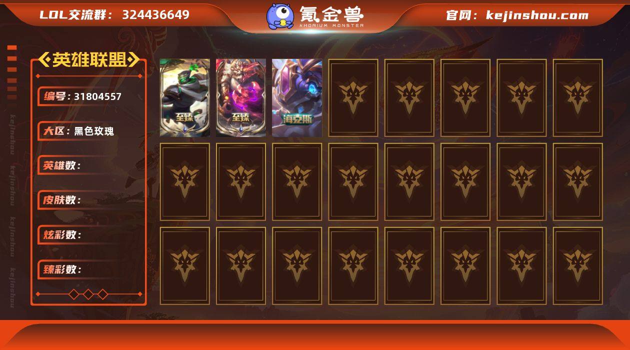 未定级段位-172英雄-627皮肤-328炫彩-1终极-21神话-81限定-58传说-153史诗 【神话皮肤】:十周年纪念安妮,源代码乐芙兰,十五周年纪念希维尔,神凰行者瑞羽圣凰艾尼维亚,殿堂传奇薇恩,海克斯科技安妮,海克斯科技嘉文四世,海克斯科技卡萨丁,摄魂使者薇恩,至臻天龙之子伊泽瑞尔,至臻黑夜使者李青,至臻KDA卡莎,至臻绒毛菲兹,至臻神龙尊者均衡之龙沃利贝尔,至臻王国机神玄武盖伦,至臻腥红之月亚托克斯,至臻心之钢永恩,至臻焰执事布兰德 【热门头像】:爱情之歌头像 【至臻皮肤】:至臻焰执事布兰德,至臻黑夜使者李青,至臻天龙之子伊泽瑞尔,至臻王国机神玄武盖伦,至臻幻灵狮心蕾欧娜,至臻绒毛菲兹,至臻神龙尊者均衡之龙沃利贝尔,至臻KDA卡莎,至臻灵魂莲华劫,至臻战斗学院奇亚娜,至臻腥红之月亚托克斯,至臻心之钢永恩 【臻彩皮肤】:天龙之子卡莎飞龙乘云,无畏骑士瑟庄妮赤子初心,冰霜之刃艾瑞莉娅炫金,墨之影武者亚索金墨耀影,冠军掠夺者卡兹克凯旋圣装,女帝卡特琳娜纹章之刻印英勇,霸天巨兽雪崩墨菲特,可爱可爱粉红红布里茨,魔女阿卡丽虚荣,净雪之月莫甘娜冬虹,幻灵战斗兔阿萝拉梦幻强袭,西部魔影执行人卡特琳娜纯洁,心之钢伊泽瑞尔天纵才华 【年限皮肤】:你看见过我的熊猫吗安妮,替父从军花木兰,神龙烈焰金克丝,张辽文远,福牛守护者阿利斯塔,天龙之子斯莫德 【海克斯皮肤】:海克斯科技安妮,海克斯科技卡萨丁,海克斯科技嘉文四世,摄魂使者薇恩 【冰雪限定】:幸福女神乐芙兰,冰雪风暴希维尔,圣诞开心鬼提莫,圣诞精灵崔丝塔娜,圣诞狂欢努努和威朗普,圣诞糖果棒厄运小姐,圣诞狂欢基兰,胡桃夹子萨科,平安夜女神娑娜,邪恶圣诞老人维迦,夺命美人卡特琳娜,喜庆之树茂凯,冬季仙境奥莉安娜,雪默丁格,圣诞玩偶波比,圣诞老人古拉加斯,魄罗骑士瑟庄妮,圣诞老人...