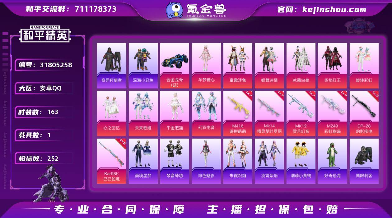 安卓 手Q-10粉装-9特效枪-1载具-4粉色飞行器-79094热力值-17王牌印记-163套装-252枪皮 【热门品类】:粉装-童趣迷兔,套装-浪漫天命,套装-深海小丑鱼,套装-小丑鱼,套装-奇异狩猎者,套装-龟仙人,套装-潮萌小黄鸭,套装-暗影哥特 【粉色套装】:粉装-蝶舞迷情,粉装-冰霜白皇,粉装-童趣迷兔,粉装-炙焰红王,粉装-旋转彩虹,粉装-心之回忆,粉装-未来歌姬,角色-千金淑猫,粉装-幻彩电音,角色-羊梦糖心 【粉色枪皮等级】:M416-暖熊萌萌(七级),AKS-74U-森灵之息(五级),Kar98K-巳巳如意(五级),Mk14-精灵梦叶罗丽(七级),MK12-雪月幻音(七级),M249-彩虹甜喵(七级),DP-28-豹影疾电(五级) 【粉色载具】:合金龙骨(蓝) 【粉色枪皮】:M416-暖熊萌萌,ACE32-萌骑漫游,AKS-74U-森灵之息,Kar98K-巳巳如意,Mk14-精灵梦叶罗丽,Mk14-福马献瑞,MK12-雪月幻音,M249-彩虹甜喵,DP-28-豹影疾电 【粉色飞行器】:炫彩糖果飞行器,相思残雪飞行器,英伦信使飞行器,幻星舰长飞行器 【粉色降落伞】:绝对恒星降落伞,春暖花开降落伞,童趣迷兔降落伞,暗夜玫瑰降落伞,洛神天依降落伞,暖熊萌萌降落伞,彩虹甜喵降落伞,旋转彩虹降落伞,仲夏莫吉托降落伞,未来歌姬降落伞,猪猪侠降落伞,精灵梦叶罗丽降落伞,星穹咏叹调降落伞,幻彩电音降落伞,冷漠罗丽降落伞,炫彩糖果降落伞 【稀有套装】:套装-龟仙人,套装-巳巳如意,套装-雪国风尚,套装-炫彩糖果,套装-马上来财,套装-雏菊兔兔,套装-萝兰蝴蝶,套装-糖糖葫芦,套装-青团波波,套装-棉花软糖,角色-许七安,套装-燕燕于飞,套装-鱼渊荷华,套装-粉恋花,套装-紫幽梦,套装-蓝冰羽,套装-霓虹热舞,套装-极速光影,套装-彩虹兔,套装-云朵鹅,套装-雪绒豹,角色-乐音,角色-绛羽幽主,套装-朱霞炽焰,套装-凌霄紫焰,角色-绯色魅影,套装-画境星梦,套装...