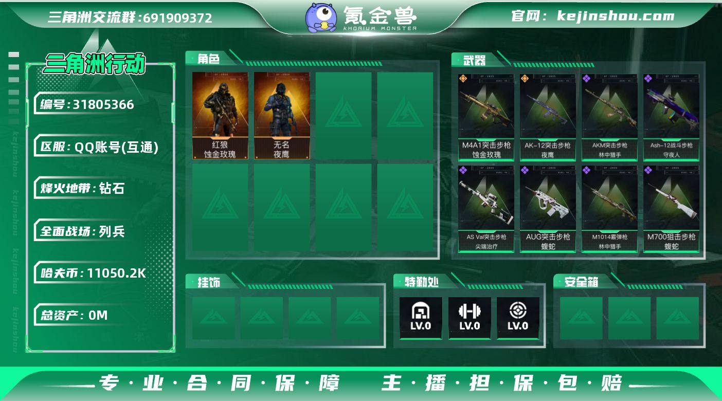 96m总资产-8099k哈伏币-60烽火等级-钻石-27战场等级-列兵 【干员外观】:红狼-蚀金玫瑰,露娜-黑·天际线,无名-夜鹰,红狼-电锯惊魂,露娜-金牌射手 【近战皮肤】:近战-暗星,近战-黑海,近战-处刑者1级,近战-黑鹰 【传说外观】:M4A1突击步枪-蚀金玫瑰,M4A1突击步枪-阿米娅,AKM突击步枪-锦绣,K416突击步枪-行动记录,SG552突击步枪-运动员,AK-12突击步枪-夜鹰,SCAR-H战斗步枪-启航,CAR-15突击步枪-阿米娅,腾龙突击步枪-捞点薯条,腾龙突击步枪-马年祥瑞,K437突击步枪-锦绣,MK47突击步枪-暗星,SMG-45冲锋枪-骑士,SMG-45冲锋枪-锦绣,SR-3M紧凑突击步枪-暗星,SR-3M紧凑突击步枪-荼蘼,勇士冲锋枪-能天使-午夜邮差,725双管霰弹枪-送葬人-无题密令,M250通用机枪-骑士之心,M14射手步枪-蛮荒,M14射手步枪-缄花,SR-25射手步枪-缄花,AWM狙击步枪-捞点薯条,.357左轮-缄花,G18-马年祥瑞,93R-捞点薯条,复合弓-黑·天际线 【史诗外观】:AKM突击步枪-林中猎手,QBZ95-1突击步枪-曙光,ASh-12战斗步枪-守夜人,K416突击步枪-腊梅,M16A4突击步枪-竞赛选手,AUG突击步枪-蝮蛇,M7战斗步枪-百步穿杨,SG552突击步枪-尖端治疗,SCAR-H战斗步枪-囚徒,G3战斗步枪-战场英杰,G3战斗步枪-流沙送葬,AS Val突击步枪-尖端治疗,AS Val突击步枪-百步穿杨,腾龙突击步枪-猎鳄行动,MP5冲锋枪-深海恐惧,MP5冲锋枪-战术竞备,MP5冲锋枪-竞技风,Vector冲锋枪-阿萨拉文明,Vector冲锋枪-百步穿杨,SMG-45冲锋枪-阿萨拉特攻,SR-3M紧凑突击步枪-荒野求生,SR-3M紧凑突击步枪-开工大吉,勇士冲锋枪-深海恐惧,勇士冲锋枪-工业狂潮,勇士冲锋枪-丛影谍踪,MP7冲锋枪-无垢,MP7冲锋枪-守护者,MP7冲锋枪-六套之力,M1014霰弹枪-林中猎手,S12K霰弹枪-曙光,PKM通用机枪-蝮蛇,PKM通用机枪-守夜人,PKM通用机枪-荒野求生...