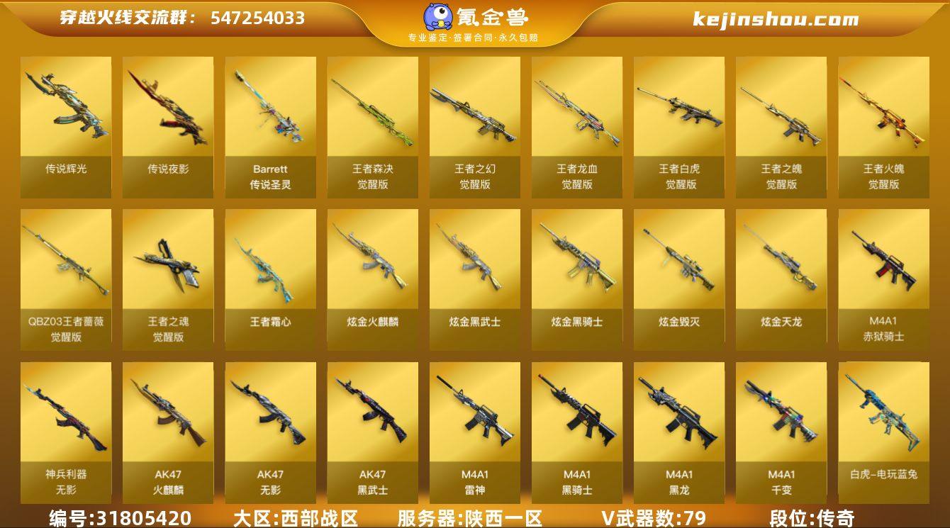 陕西一区-82V-10王者-7炫金 【传说武器】:传说辉光,传说夜影,传说圣灵 【传说角色】:传说女帝,传说艾莉莎 【热门武器】:传说圣灵,传说夜影,传说辉光,QBZ03-金色蔷薇,M14EBR-玄武,Scar Light-白虎,HK417-朱雀,M4A1-青龙,M200-幻神,M200-竞技荣光,白虎-电玩蓝兔,柯尔特-冠军之特,Kar98K-星神,炼狱-迷你小钢,M4A1-黑骑士*2,加特林-炼狱,斯泰尔-蝴蝶,裁决-雪莉杨,USP-雷暴,沙鹰-修罗*2,Knife-冠军之刃 【王者炫金武器】:王者霜心,炫金火麒麟,炫金骑士,炫金武士*2,炫金毁灭,炫金天龙*2 【音效卡】:屠龙-动感闪耀 音效卡,天神-动感闪耀 音效卡,烈火-动感闪耀 音效卡,M200-幻神音效卡,M4A1-雷神音效卡,M4A1-黑龙音效卡,M4A1-黑骑士音效卡,Barrett-毁灭音效卡,Scar Light-白虎音效卡,白鲨语音包 【皮肤】:M200-幻神-黄忠皮肤,幻神-降龙,白虎-电玩粉兔皮肤,QBZ03-冠军之薇,星神-璀璨皮肤,雷神-星空,雷神-冠军之魄,雷神-动感闪耀 皮肤,火麒麟-冠军之心,火麒麟-轻羽皮肤,火麒麟-心动糖果,毁灭-冠军之怒,毁灭-风暴,毁灭-魔灵皮肤,毁灭-直播专属,M4A1-千变-孔明皮肤,黑龙-墨子皮肤,黑骑士-战神马超,天启-暗月,战神-粉色甜心皮肤,战神-流金岁月皮肤*2,AK47-B-常胜将军-曹操,AK47-B-常胜将军-刘备,AK47-B-常胜将军-孙权,修罗-冠军之魂*2 【角色】:雨棠,电竞教官-云悠悠,鹰,王者-葵-貂蝉,王者葵-惊若翩鸿,王者涂鸦,王者沙漠玫瑰,乔伊教练,初恋灵狐,芳心审判者,风暴女,嘉年华灵狐,龙儿,女主播,潘多拉-X,斯沃特-X,兔囡囡,樱-青春偶像,职业选手 【人偶武器】:裁决-雪莉杨,天龙-曼陀罗*2,炼狱-迷你小钢,斯泰尔-蝴蝶,AWM-灵狐-15周年嘉年华,黄金迷你裂空之翼,迷你波特博士*2,深渊终结者手雷,迷你超能女侍,灵狐娃娃手雷 【暴走生化】...
