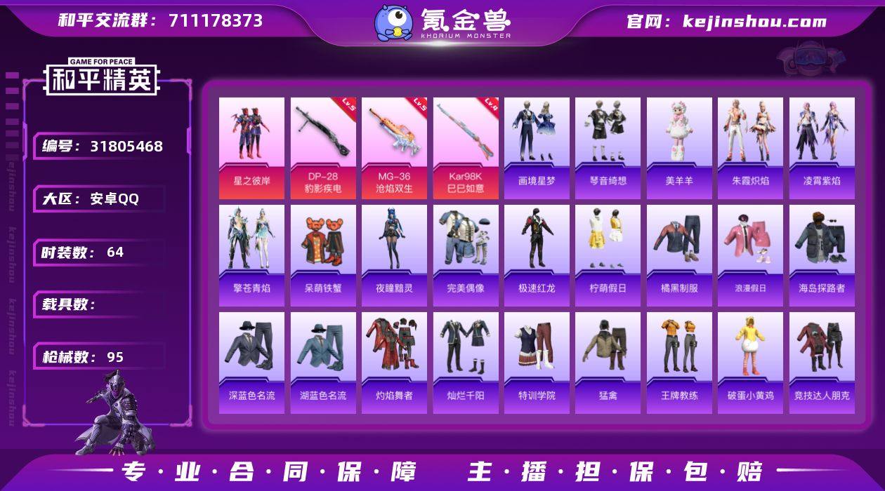 安卓 手Q-1粉装-7特效枪-0载具-1粉色飞行器-24634热力值-1王牌印记-64套装-95枪皮 【粉色套装】:粉装-星之彼岸 【粉色枪皮等级】:AKS-74U-森灵之息(四级),Kar98K-巳巳如意(四级),DP-28-豹影疾电(五级),MG-36-沧焰双生(五级) 【粉色枪皮】:UMP45-萌骑冒险,AKS-74U-森灵之息,Kar98K-巳巳如意,Mk14-福马献瑞,DP-28-豹影疾电,MG-36-沧焰双生,信号枪-金乌曜日 【粉色降落伞】:第五大道降落伞,炫光之旅降落伞,鬼刀降落伞,无垠阁降落伞,镜花水月降落伞 【稀有套装】:套装-马上来财,角色-夜瞳黯灵,套装-朱霞炽焰,套装-凌霄紫焰,套装-擎苍青焰,玩偶服-美羊羊,套装-画境星梦,套装-琴音绮想,套装-雨过天青,套装-红釉青花,角色-霜纹水星,角色-孙斩天 【稀有枪皮】:AKM-影袭,M16A4-红色方程式,SCAR-L-夜灯,SCAR-L-炫彩节奏,M416-红色方程式,AUG-幻影战神,AUG-耀粉歌者,ACE32-画境星梦,ARX-凌霄紫焰,UZI-天降萌叽,UZI-红色方程式,UMP45-夜灯,UMP45-猪猪侠,UMP45-生命誓言,汤姆逊-环太平洋,汤姆逊-耀粉歌者,MP5K-画境星梦,JS9-凌霄紫焰,P90-巳巳如意,Kar98K-洛神天依,SKS-迅猛狂鲨,AMR-喜羊羊与灰太狼,SVD-冷漠罗丽,M1加兰德-画境星梦,S12K-夜灯,DBS-荧海星豚,AA12-G-画境星梦,M249-破晓战魂,M249-糯团青竹,M249-绒绒猫尾,M249-绯穹魔姬,DP-28-彩虹符号,MG3-幻世战舞者,MG-36-凌霄紫焰,P92-凌霄紫焰,爆炸猎弓-喜羊羊与灰太狼,镰刀-咒蚀之裁,平底锅-凌霄紫焰,平底锅-画境星梦 【其他套装】:套装-完美偶像,套装-极速红龙,套装-柠萌假日,套装-橘黑制服,套装-浪漫假日,套装-海岛探路者,套装-深蓝色名流,套装-湖蓝色名流,套装-灼焰舞者,套装-灿烂千阳,套装-特训学院,套装-猛禽,套装-王牌教练,套装-破蛋小黄鸡,套装-竞技达人朋克,套装-红色运动,...
