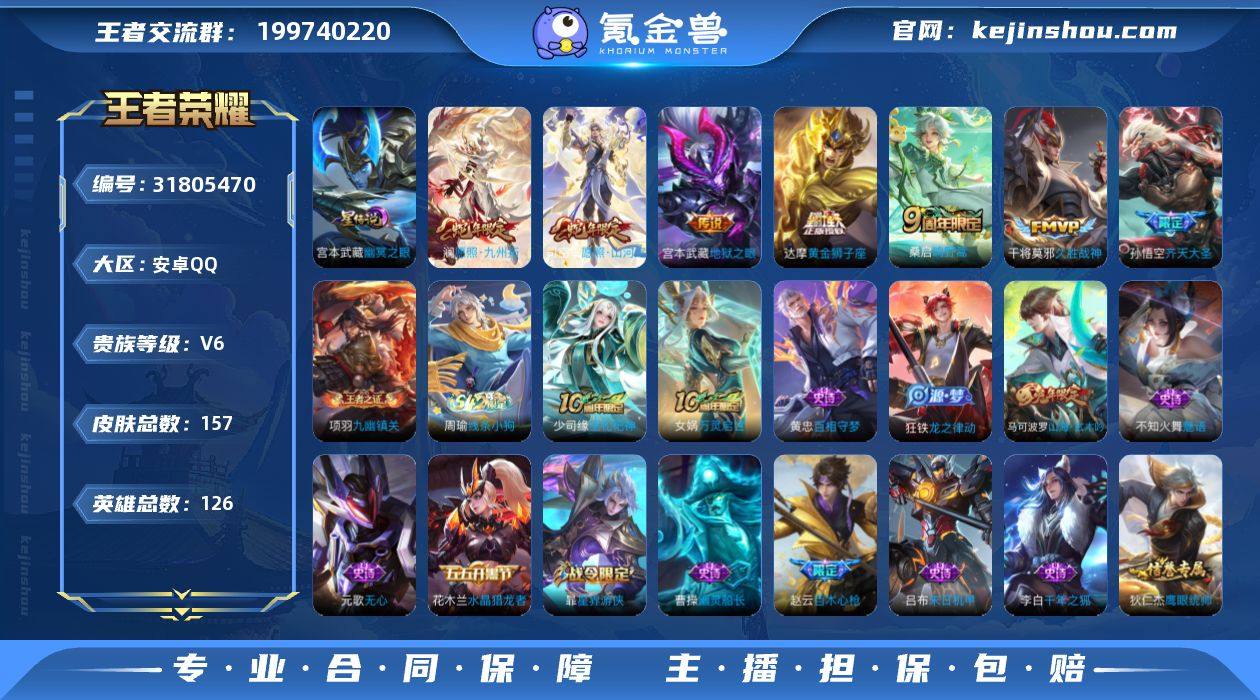 贵族6/皮肤157/传说7/史诗44/英雄126/幽冥之眼/愿照·山河定/愿照·九州拓/鸣野蒿/齐天大圣/久胜战神/黄金狮子座/地狱之眼/天穹之誓(s36)/阴阳师/皇家上将/百木心枪/蔷薇恋人/无心/山海·玄木吟/魔术师/海滩派对/云中旅人(s29)/胡桃夹子/原初追遂者/擒涛扼浪(s31)/暖冬·兔眠/探海日志(s32)/海盐诗旅(s30)/星界游侠/古海寻踪(s33)/蒙恬荣光圣徽/鬼谷子天穹祈灯(S34)/龙武盛年/剑破天穹(s35)/熔金海岸/噬灭天穹(s37)/谧流熔炉/虚灵犬护/逆浪荇歌/荣光之誓/星界战将/九幽镇关/线条小狗-周瑜/圣诞恋歌/偶像歌手/地狱岩魂/鬼剑武藏/水果甜心/摇滚巨星/魅力维加斯/金属风暴/圣诞狂欢/绅士熊喵/幽灵船长/千年之狐/末日机甲-吕布/乱世虎臣/水晶猎龙者/德古拉伯爵/乘风破浪/缤纷独角兽/暗隐猎兽者/黄金分割率/心灵战警/冰冠公主/天才门将/逐浪之夏/功夫厨神/星夜王子/节奏热浪/鹰眼统帅/魅语/龙之律动/百相守梦-黄忠/万灵启世/巫礼祀神/教廷特使/街头霸王/哥特玫瑰/忍·炎影/白色死神/西部大镖客(牛魔)/救世之瞳/未来纪元-宫本武藏/玩偶对对碰/少女阿狸/黄金武士/死亡骑士/兔女郎/花好人间/纽约教父/龙腾万里/海滩丽影/功夫老勺/沉稳之力/敏锐之力/守护之力/丁香结/鲨炮海盗猫/次元突破/秘密基地/乓乓大师/唤灵魔甲/蔚蓝守将/幻泉雾影-海月/潮玩探月行/牛运亨通/乐园追猎者/太极少年/劲辣红锅/零食大作战/完美运算/功夫炙烤/暗都幽影/敬我三分/雾都夜雨/苍林狼骑/铁骨偃魂/雪境奇遇-西施/星梦巡礼/景韶洛都/玫蓝誓约/春野闲踪/灵野札记/布丁狗之约/命运加冕/小满鸭/踏浪烽翎/克喵/罗小黑战记/鹤鸣心笺/溯影追猎/班班快跑/生化警戒/精灵公主/精灵王/隐刃/地府判官/加勒比小姐/维京掠夺者/埃及法老/龙域领主/绝影神枪/尼罗河女神/花间舞/踏雪寻梅/精准探案法/海之征途/魇语军师/极冰防御线/花见巫女/灼热之刃/创世神祝/归虚梦演-...