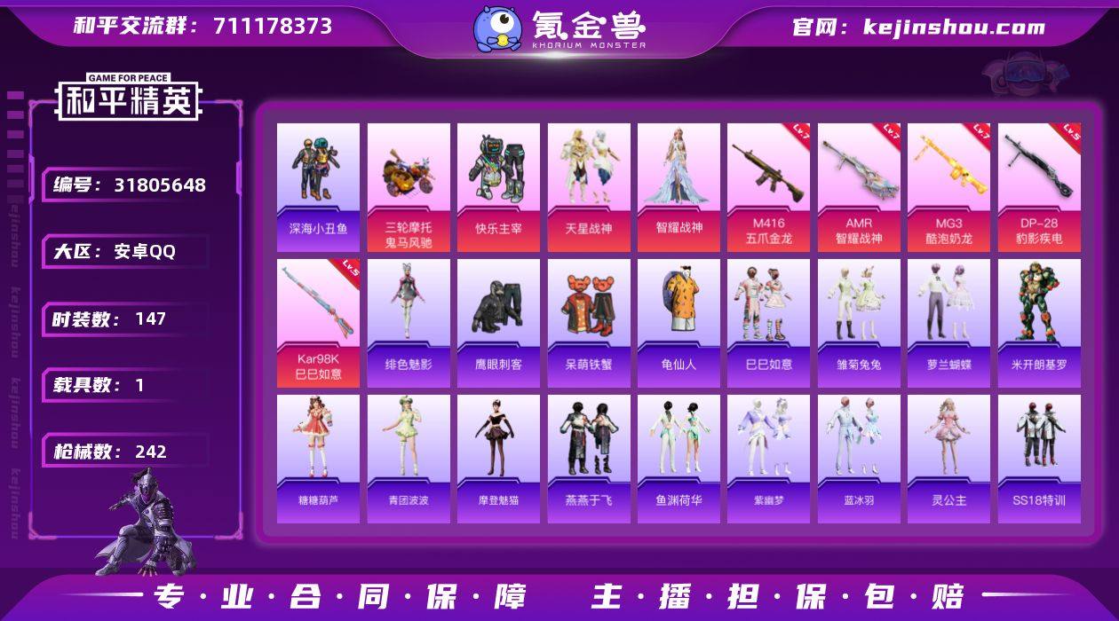 实名: 可修改 时装数: 147 载具数: 1 枪械数: 242 战备数: 172 热门装扮: 呆萌铁蟹,快乐主宰,深海小丑鱼,鹰眼刺客,天星战神,智耀战神 载具: 鬼马风驰 稀有枪皮: M416五爪金龙,MG3酷泡奶龙,Kar98K-巳巳如意,AMR-智耀战神,DP-28-豹影疾电 亮点: 安卓 手Q-3粉装-8特效枪-1载具-2粉色飞行器-68616热力值-14王牌印记-147套装-242枪皮HZ262248【热门品类】:套装-深海小丑鱼,套装-龟仙人【粉色套装】:粉装-快乐主宰,粉装-天星战神,角色-智耀战神【粉色枪皮等级】:M416-五爪金龙(七级),AKS-74U-森灵之息(五级),Kar98K-巳巳如意(五级),AMR-智耀战神(七级),DP-28-豹影疾电(五级),MG3-酷泡奶龙(七级)【粉色载具】:鬼马风驰【粉色枪皮】:M416-五爪金龙,ACE32-萌骑漫游,AKS-74U-森灵之息,Kar98K-巳巳如意,Mk14-福马献瑞,AMR-智耀战神,DP-28-豹影疾电,MG3-酷泡奶龙【粉色飞行器】:炫彩糖果飞行器,千面幻镜飞行器【粉色降落伞】:至尊龙雀降落伞,恐龙拽拽降落伞,旋转彩虹降落伞,音爆索尼克降落伞,第五大道降落伞,萌物绒绒降落伞,圣堂之誓降落伞,江南烟雨降落伞,精灵梦叶罗丽降落伞,忍者神龟降落伞,炫彩糖果降落伞【稀有套装】:套装-龟仙人,套装-巳巳如意,...