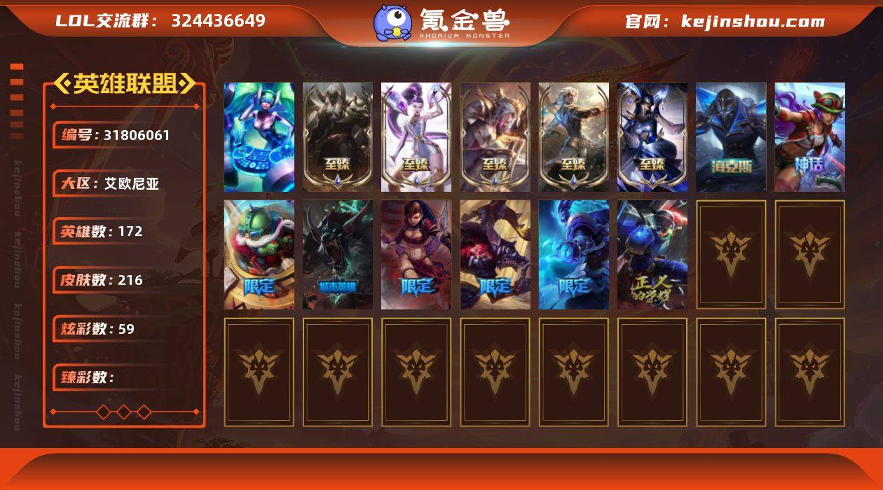 t36514【艾欧尼亚】 216皮肤 59炫彩 9神话/24限定/24传说/172英雄 账号等级:524 单双排段位:黄金 【重要头像】至臻青花瓷丽桑卓 【重要皮肤】青花瓷丽桑卓至臻 女帝黛安娜至臻 黑夜使者凯隐至臻 KDA二代卡莎至臻 腥红之月亚托克斯至臻 胜利行刑官德莱文 胜利剑圣易 胜利之树茂凯 胜利女神奥莉安娜 胜利枪神格雷福斯 胜利枪神卢锡安 胜利之剑亚托克斯 大魔法锅布里茨 SKTT1阿兹尔 SKTT1伊莉丝 SSW辛吉德 SKTT1婕拉 暗杀星努努和威朗普 Fnatic迦娜 冰雪节格雷福斯 冰雪节辛吉德 防暴天使凯尔 冠军典狱长锤石 女猎手希维尔 圣诞精灵崔丝塔娜 外星装甲库奇 暗影沃里克 都铎王朝图奇 十五周年纪念希维尔 十周年纪念安妮 神凰行者瑞羽圣凰艾尼维亚 DJ娑娜 【传说皮肤】驯龙炮手崔丝塔娜 灵魂莲华锤石 烈焰雄心崔丝塔娜 地狱行者孙悟空 女帝卡特琳娜 战斗学院伊泽瑞尔 神拳李青 天煞劫 血石领主弗拉基米尔 冰川巨兽墨菲特 鬼魂新娘莫甘娜 双重冰晶艾尼维亚 泳池派对吉格斯 源计划联合艾希 星之守护者金克丝 炼狱魔犬内瑟斯 女皇艾希 黑夜使者亚索 黎明使者锐雯 灌篮高手德莱厄斯 提莫约德尔人的一大步 魔幻卡牌崔斯特 最终BOSS维迦 【重要炫彩】魔女卡蜜尔贪婪 腥红之月卡特琳娜落樱 黑暗骑士卡莉丝塔魅惑劫掠者 腥红之月易落樱 抵抗军炎魔俄洛伊粉红魅焰 光明骑士古拉加斯浪漫守望者 皮城女警凯特琳死亡蔷薇