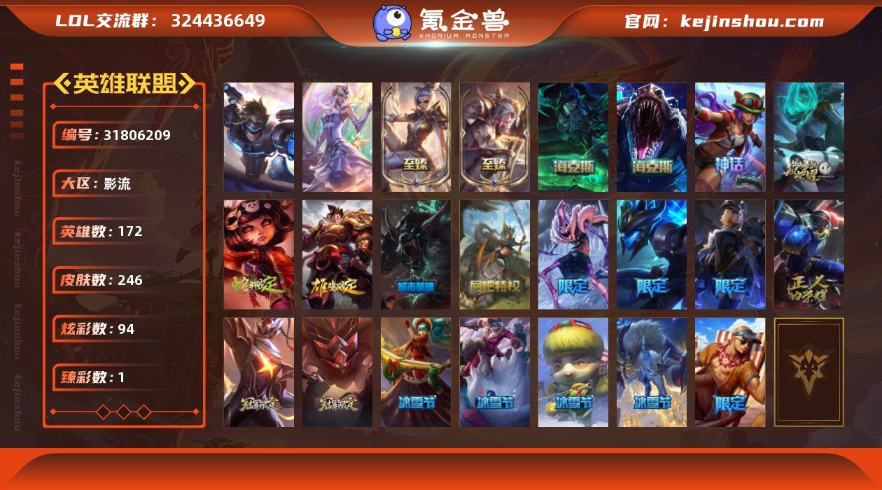 t36547【影流】246皮肤 94炫彩 1臻彩 8神话/43限定/23传说/172英雄 账号等级:831 单双排段位:钻石 【重要头像】冬境仙灵索拉卡 KDA阿狸 SSG伊泽瑞尔 战斗学院悠米 女帝卡特琳娜 至臻女帝黛安娜 【重要皮肤】女帝黛安娜至臻 玉剑传说武剑仙至臻 玉剑传说武剑仙2022至臻 海克斯科技雷克顿 摄魂使者薇恩 胜利剑圣易 胜利女神娑娜 胜利之王泰达米尔 胜利巨口克格莫 荣誉使者玛尔扎哈 星之守护者伊泽瑞尔 玉剑传说无影 你看见过我的熊猫吗安妮 张辽文远 胜利女神奥莉安娜 胜利枪神格雷福斯 胜利枪神卢锡安 胜利之剑亚托克斯 狂心冰王图奇 魄罗骑士瑟庄妮 平安夜女神娑娜 圣诞糖果棒厄运小姐 泳池派对李青 FPX锤石 FPX墨菲特 SSG霞 SSG嘉文四世 SSG伊泽瑞尔 SKTT1艾克 SKTT1贾克斯 SKTT1劫 SKTT1婕拉 SKTT1李青 SKTT1薇恩 防暴天使凯尔 冠军之矛卡莉丝塔 冠军之血希瓦娜 南瓜头费德提克 圣诞开心鬼提莫 圣诞老人古拉加斯 糖果使徒费德提克 无头骑士赫卡里姆 喜庆之树茂凯 雪默丁格 野兽猎人瑟庄妮 暗影沃里克 十五周年纪念希维尔 十周年纪念安妮 源代码乐芙兰 胜利凤凰艾尼维亚 大元素使拉克丝 未来战士伊泽瑞尔 【传说皮肤】鬼魂新娘莫甘娜 神龙尊者昼日真龙亚索 宇航员诺提勒斯 绅士科加斯 驯龙炮手崔丝塔娜 女主播迦娜 双重冰晶艾尼维亚 魔幻卡牌崔斯特 地狱之门卫士加里奥 大天使长米迦勒凯尔 最终BOSS维迦 源计划联合艾希 第三类接触黑默丁格 霸天异形卡兹克 战场女武神凯尔 女校长菲奥娜 源计划净化薇恩 黑夜使者亚索 未来战士凯特琳 黯黑魔龙希瓦娜 冰霜亚龙希瓦娜 灌篮高手德莱厄斯 【重要炫彩】冠军掠夺者卡兹克凯旋圣装 奥德赛娑娜恒星游历者 霸天异形卡兹克变革特攻 皮城女警凯特琳死亡蔷薇