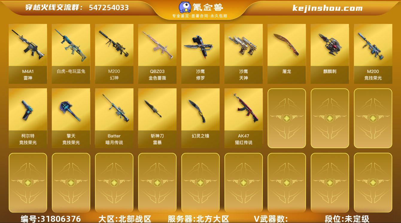 5286/北部/北方大区/可排位【传奇4】【Lv.102 荣耀元帅】VIP6/46V/幻神/幻神宠儿/M200竞技荣光/QBZ金色蔷薇/QBZ金色普薇竞星跃动音效卡/白虎电玩蓝兔/朱雀电竞之星/无影神兵利器/黑武士锦绣游龙/雷神/柯尔特竞技荣光/【音效卡】/玄武音效卡/毁灭云海玲珑/居龙电竞之星竞星跃动音效卡/朱雀电竞之星竞星跃动音效卡/【枪皮】 毁灭虹光风暴/极光能量核心/AK雷神/雷神荣耀之魄/雷神新春神龙/【四防】妮妮/【角色】铁扇公主/奇洋探员/虚空/乔伊教练/灵狐者黄金海岸/【道具】/永久烟雾头/护目镜/超级背包/各种戒指/各种光效/各种玩偶/永久AC/永久雷包/细节看图/