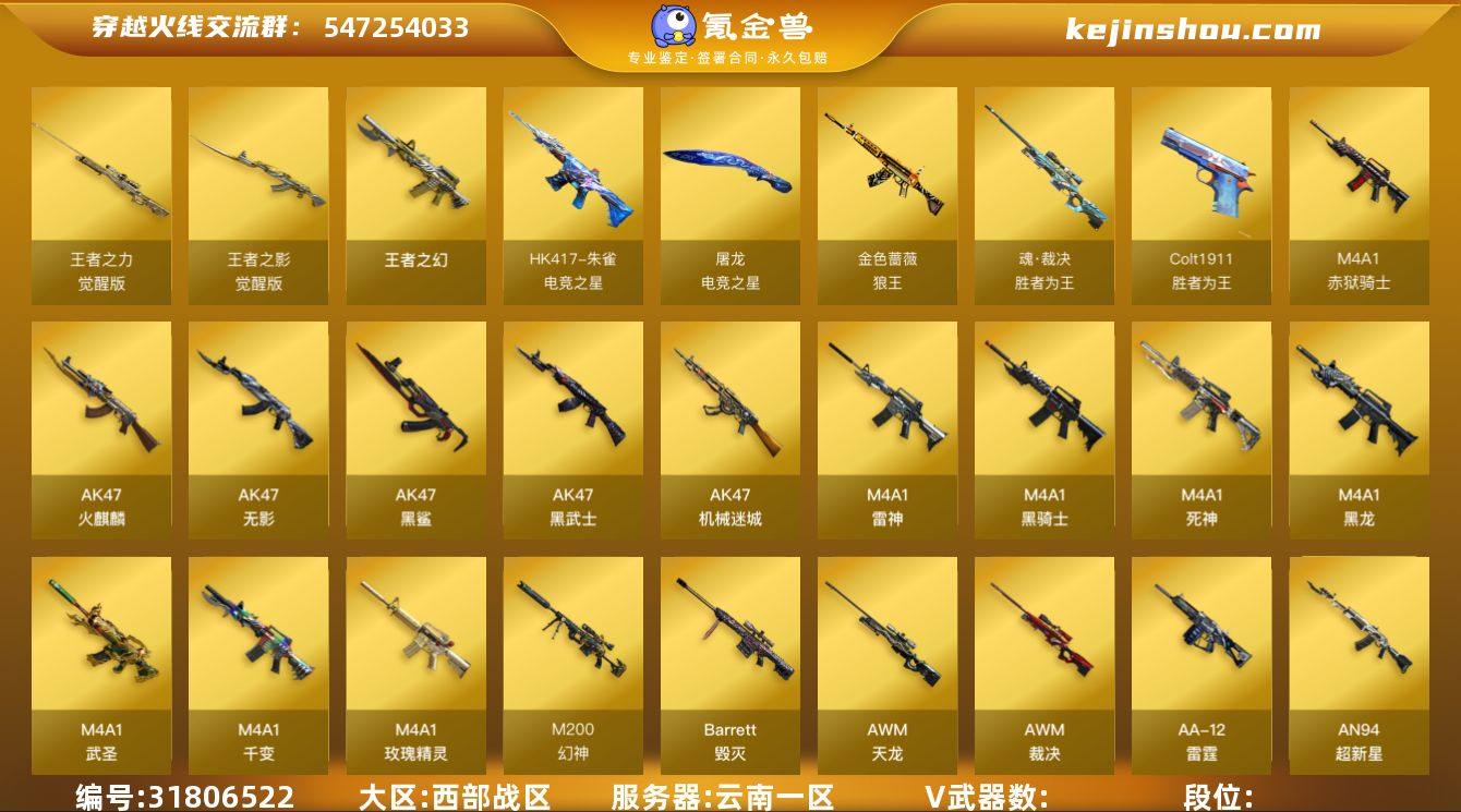 /西部/云南一区/可排位/段位未定段/Lv.102 荣耀元帅/59V/幻神/幻神荣耀世冠白鲨/幻神黄忠/QBZ金色蔷薇/白虎/朱雀电竞之星/荣耀世冠柯尔特/裁决/毁灭/天龙/雷神/黑骑士/5烈龙/4炼狱/猫猫手套/【音效卡】/雷神音效卡/黑骑士音效卡/毁灭音效卡/【枪皮】/火麒麟巅峰荣耀/【角色】/葵/樱/魅影/战地猎狐/修道士/乔伊教练/【小人枪】/雷神小红/【道具】/永久超级背包/各种戒指/各种光效/各种玩偶/永久AC/永久雷包/细节看图/【此账号未被封过十年】