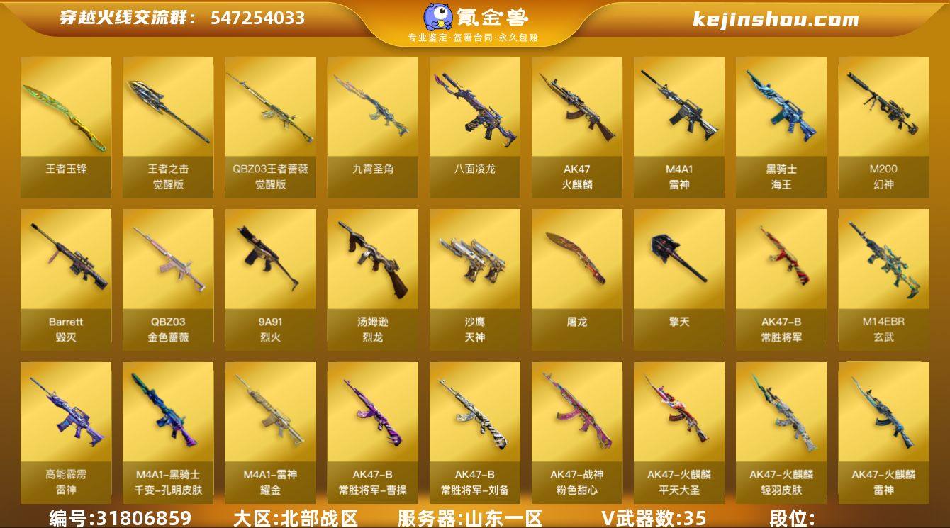 35V/100级/元帅/6王者/1英雄/幻神三件套/QBZ03-金色蔷薇/M14EBR-玄武/M200-幻神/八面凌龙/汤姆逊-烈龙/王者森力/王者玉锋/M200-幻神音效卡/M14EBR-玄武音效卡/九霄圣角音效卡/M4A1-苍鸣雷神音效卡/M200-幻神-黄忠/幻神-电流骇客/雷神-耀金皮肤/雷神-高能霹雳/火麒麟-雷神/火麒麟-轻羽皮肤/火麒麟-平天大圣/毁灭-魔灵皮肤/M4A1-千变-孔明皮肤/九霄圣角-高洁仙镜 皮肤/战神-粉色甜心皮肤/AK47-B-常胜将军-曹操/AK47-B-常胜将军-刘备/迷迭香/乔伊教练/暗夜-X/飞虎队-X/风暴女/虎妞/嘉年华灵狐/娟娟/灵动武士/灵狐者-黄金海岸/麻雀/潘多拉-X/邱刚敖/新灵狐者/AWM-灵狐-15周年嘉年华/迷你裂空之翼/夺魂/迷你牛牛/深渊终结者手雷/闪光弹-貂蝉/高爆手雷-大乔/迷你艾比/灵狐娃娃手雷/超级对讲机/AK47-冰龙粉碎者/冰龙粉碎者-白马银枪/激光毁灭者III-白马银枪/KAC-圣炎切割者/AK47-火麒麟/M4A1-雷神/九霄圣角/9A91-烈火/黑骑士-海王/AK47-B-常胜将军/QBZ-03-王者蔷薇-觉醒版/Barrett-毁灭/沙鹰-天神/屠龙/擎天/王者之击-觉醒版/高爆手雷-幻灵/高爆手雷-云龙/闪光弹-幻灵/闪光弹-云龙/烟雾弹-云龙/XROCK炫彩背包/背包-葫芦兄弟/超级背包/女皇终结者-魔龙之吻/绿色巨人/灵魂忍者/迷雾幽灵/夺命之镰/防化服/金色流光-枪王排位/星辰流光-枪王排位/枪王排位28赛季金色流光/防弹头盔/防弹衣/C4工具钳/手雷包