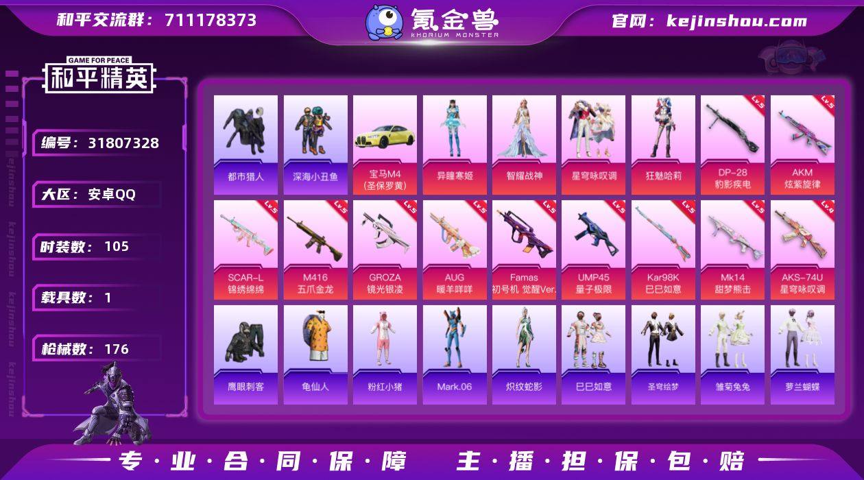 安卓 手Q-4粉装-13特效枪-1载具-1粉色飞行器-53577热力值-4王牌印记-105套装-176枪皮 【热门品类】:套装-都市猎人,套装-深海小丑鱼,套装-龟仙人,套装-粉红小猪,角色-Mark.06 【粉色套装】:角色-智耀战神,粉装-星穹咏叹调,角色-狂魅哈莉,角色-异瞳寒姬 【粉色枪皮等级】:AKM-炫紫旋律(五级),SCAR-L-锦绣绵绵(五级),M416-五爪金龙(五级),GROZA-镜光银凌(五级),AUG-暖羊咩咩(五级),Famas-初号机 觉醒Ver.(五级),UMP45-量子极限(五级),AKS-74U-星穹咏叹调(四级),Kar98K-巳巳如意(五级),Mk14-甜梦熊击(五级),DP-28-豹影疾电(五级) 【粉色载具】:宝马M4(圣保罗黄) 【粉色枪皮】:AKM-炫紫旋律,SCAR-L-锦绣绵绵,M416-五爪金龙,GROZA-镜光银凌,AUG-暖羊咩咩,Famas-初号机 觉醒Ver.,ACE32-萌骑漫游,UMP45-量子极限,AKS-74U-星穹咏叹调,Kar98K-巳巳如意,Mk14-甜梦熊击,Mk14-福马献瑞,DP-28-豹影疾电 【粉色降落伞】:墨龙九天降落伞,初号机 觉醒Ver.降落伞,临安公主降落伞,星穹咏叹调降落伞,幻星舰长降落伞,幻彩电音降落伞,时光之誓降落伞,双重狂想降落伞 【稀有套装】:套装-龟仙人,套装-炽纹蛇影,套装-巳巳如意,套装-圣穹绘梦,套装-马上有钱,套装-雏菊兔兔,套装-萝兰蝴蝶,套装-糖糖葫芦,套装-青团波波,角色-怀庆长公主,套装-燕燕于飞,套装-鱼渊荷华,套装-粉恋花,套装-紫幽梦,套装-蓝冰羽,套装-星影赞美诗,套装-星渊小夜曲,套装-霓虹热舞,套装-极速光影,套装-彩虹兔,套装-云朵鹅,套装-雪绒豹,套装-诡诞巡游,套装-混沌火种,套装-雨过天青,套装-红釉青花 【稀有枪皮】:AKM-影袭,AKM-龙的传人,M16A4-红色方程式,M416-绯红前夜,GROZA-影袭,GROZA-懵萌河马,AUG-天降萌叽,AUG-耀粉歌者,AUG-月影灵韵,QBZ-彩虹符号,M762-绯红前夜,M762-云朵鹅,G3...