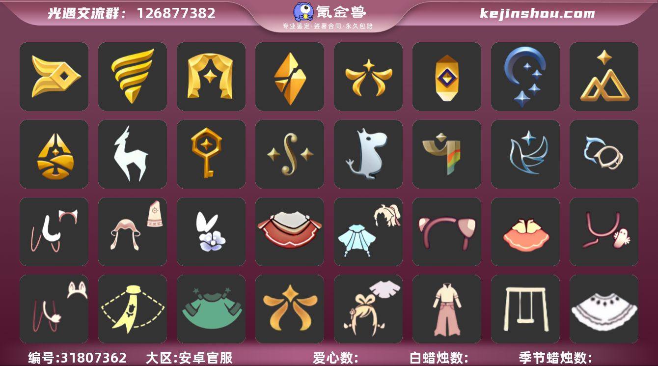 账号类型: 手机账号 季节已毕业: 风行季,潜海季,表演季,破晓季,欧若拉季,夜行季,追忆季,拾光季,归巢季,九色鹿季,筑巢季,二重奏季,姆明季,彩染季,青鸟季,双星季 完成地图: 晨岛,雨林,霞谷 珍稀物品: 白枭,透明蝶翼斗 礼包: 围巾,星球斗,欧若拉之翼,绊爱,牛仔裤,秋千,白绒金,致爱装扮,人声乐器,橘子,贝壳,兔子,雪花,水母,星月头饰,四叶草,满月耳坠,锦标赛短袍,锦标赛桂冠,线框斗,姆明饰品套装,树精肩饰,妮妮斗篷,粽子发饰礼包,青衫落拓礼包,缤纷飘带斗篷礼包,蝴蝶与花发饰礼包,日光水母套装礼包,皮皮猫套装礼包 裤子: 武士裤,背带裤,白棉裤,搓澡巾 面具: 黄鼠狼,红狐狸 面饰: 红耳机,黑框眼镜 项链: 围巾 发型: 正太,樱花,公主头,虚荣,猫耳,白枭 头饰: 花环 斗篷: 白金,红金,白鸟斗,花瓣斗篷,荧蓝斗篷,玫瑰褶边斗篷 配饰: 雨伞,高音钢琴,吉他,笛子,大铃铛乐器,乐器 亮点: 重塑药水156