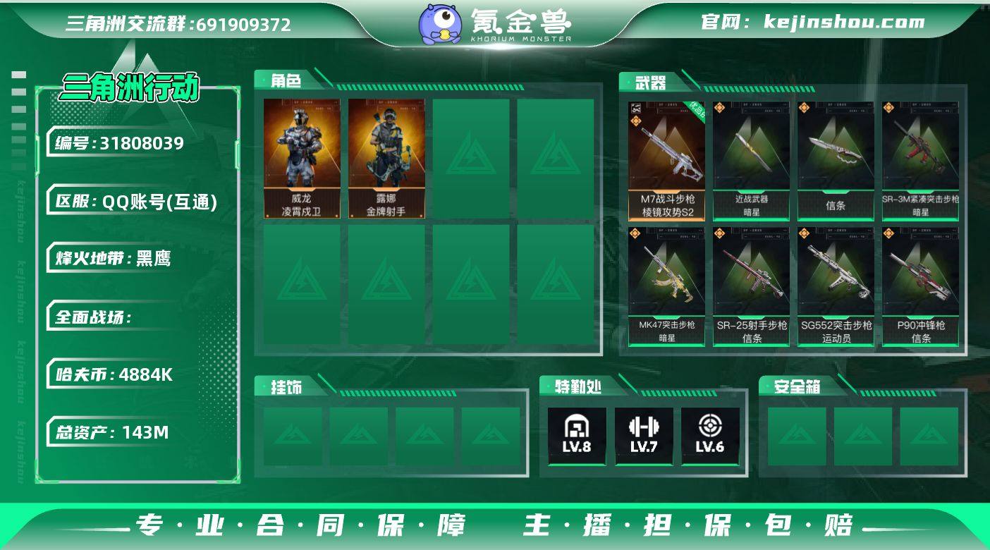 "XXB-4884k哈伏币-总资产143m流动资产103m-60烽火等级-黑鹰-17战场等级-上等兵 部门33333特勤处仓库8训练中心7靶场6 M7战斗步枪-棱镜攻势S2(优品)B 【干员外观】:威龙-凌霄戍卫,露娜-金牌射手 【近战皮肤】:近战-暗星,近战-信条,近战-黑鹰 【典藏外观】:M7战斗步枪-棱镜攻势S2 【传说外观】:M7战斗步枪-巳蛇,SG552突击步枪-运动员,MK47突击步枪-暗星,P90冲锋枪-信条,SR-3M紧凑突击步枪-暗星,M14射手步枪-蛮荒,SR-25射手步枪-信条