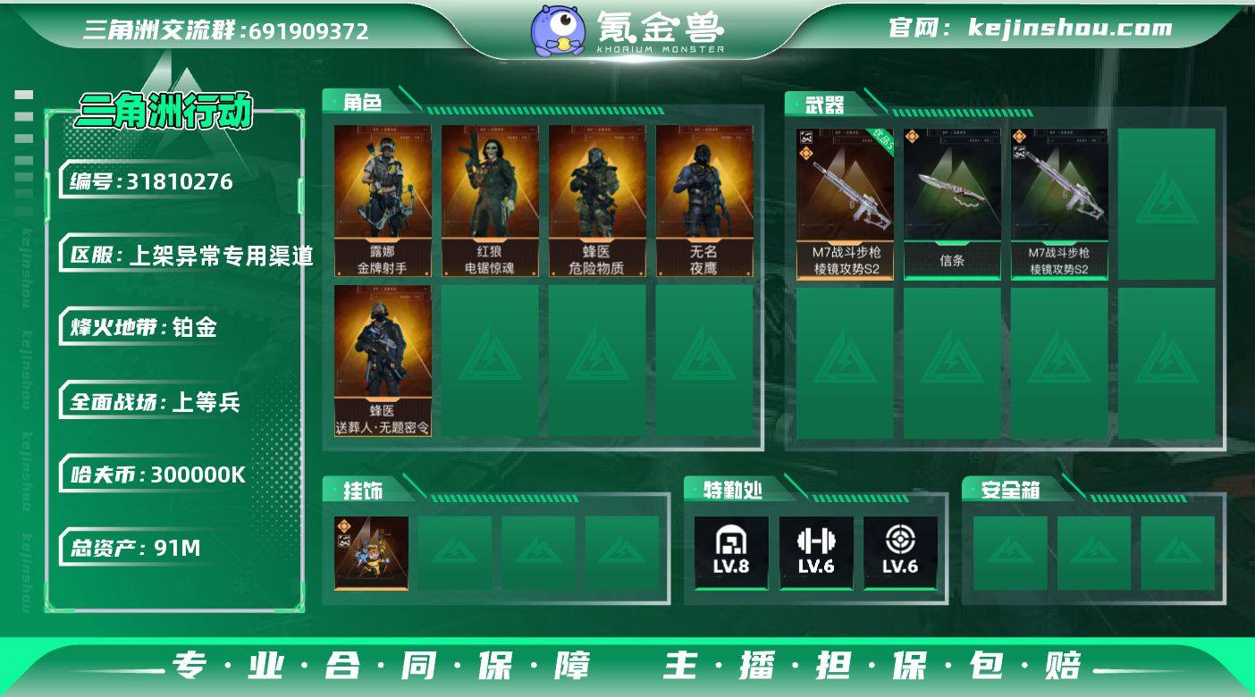 实名:不可二次实名 总资产:91M 哈夫币:300000K 烽火地带段位:铂金 烽火地带等级:60 全面战场段位:上等兵 8级仓库,6级训练中心,6级靶场,0级潜水中心,0级收藏室 战术部门等级:2 战斗部门等级:2 医疗部门等级:2 研发部门等级:3 后勤部门等级:2 曼德尔砖-棱镜攻势S2:1