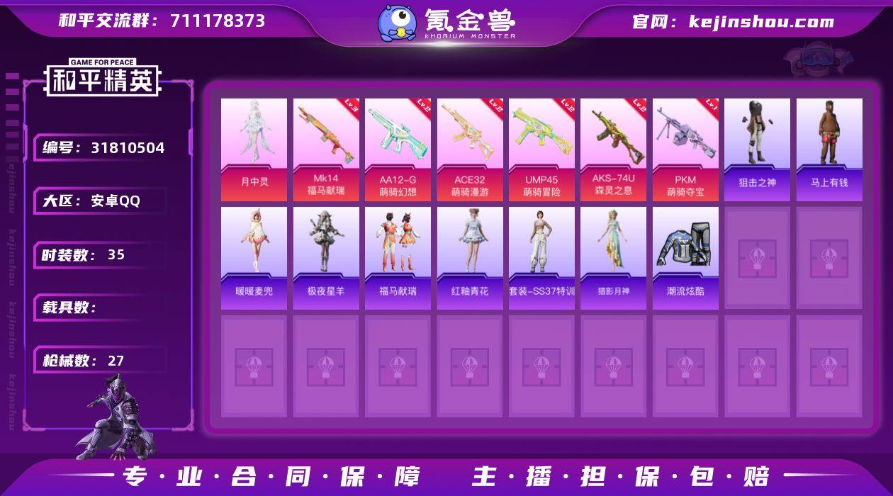 月中灵!云朵驼驼飞行器!特权卡余300天!D11203.安卓QQ.10套装1粉装26枪皮6粉枪1飞行器.5735热力值. 【粉色套装】角色-月中灵 【粉色枪皮】Mk14-福马献瑞[3级]/ACE32-萌骑漫游[2级]/UMP45-萌骑冒险[2级]/AKS-74U-森灵之息[2级]/AA12-G-萌骑幻想[2级]/PKM-萌骑夺宝[1级]