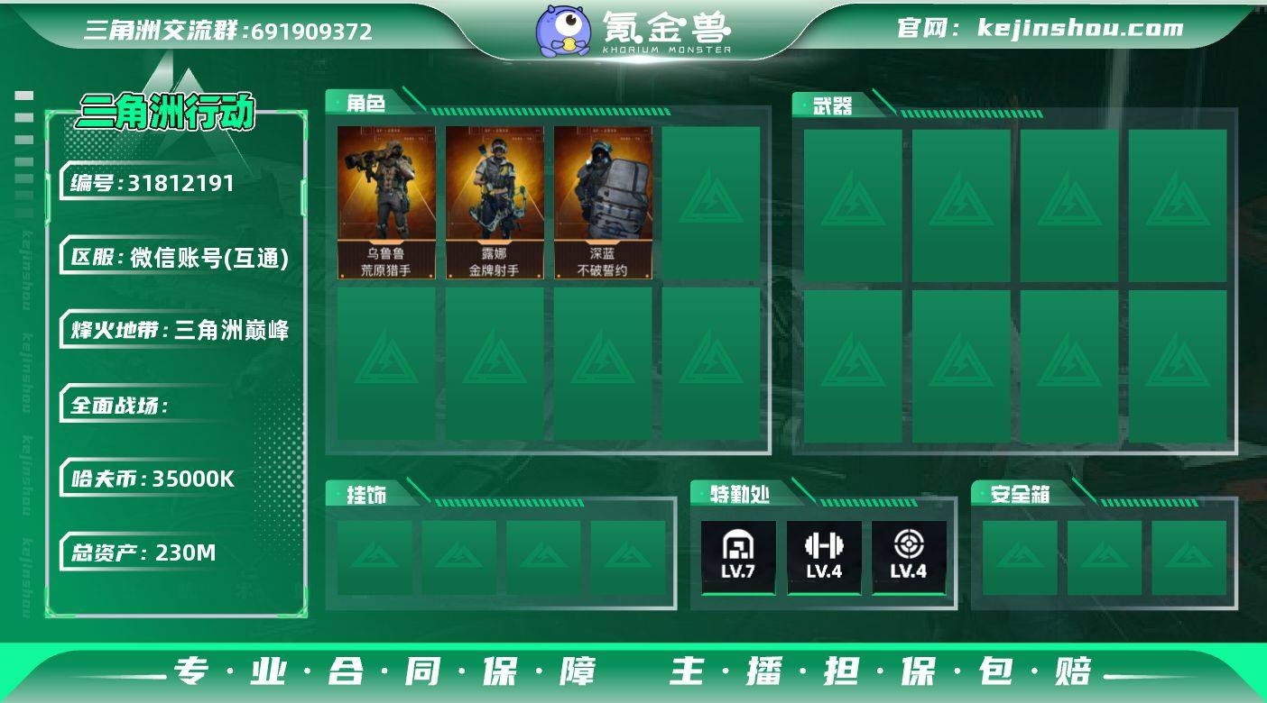 实名:不可二次实名 总资产:230M 哈夫币:35000K 烽火地带段位:三角洲巅峰 烽火地带等级:60 全面战场等级:0 7级仓库,4级训练中心,4级靶场,0级潜水中心,1级收藏室 战术部门等级:1 战斗部门等级:1 医疗部门等级:1 研发部门等级:1 后勤部门等级:1