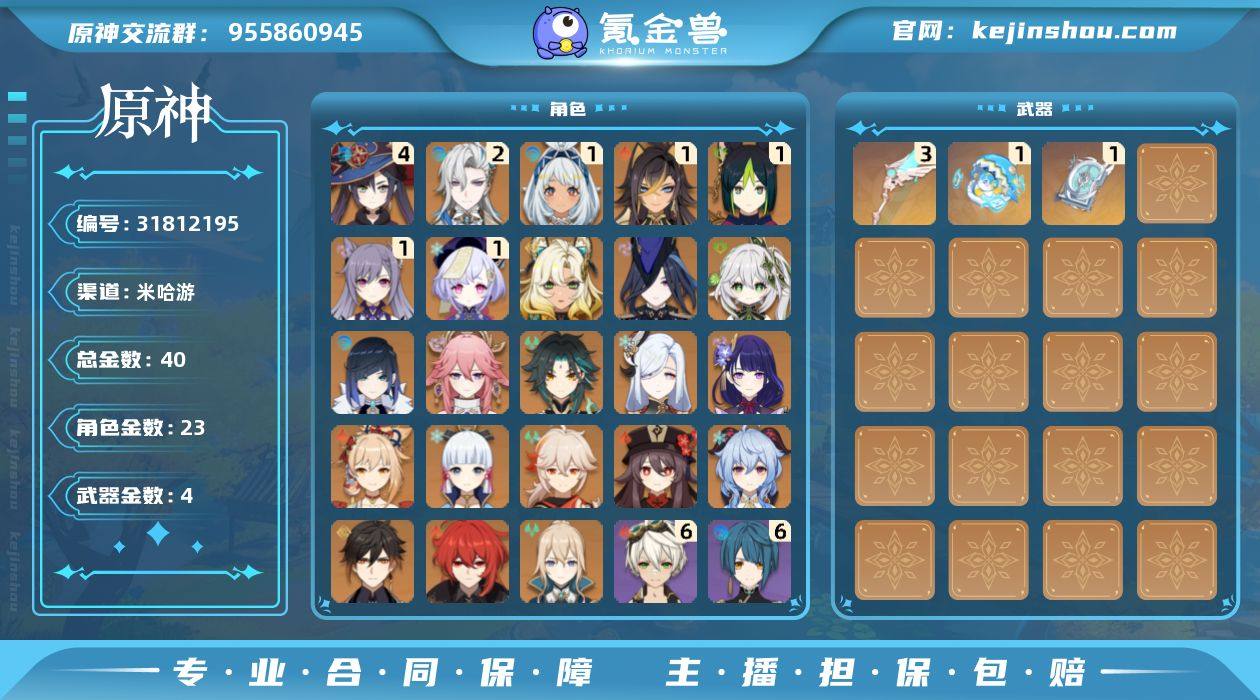 邮箱: 未绑定 总黄数: 40 冒险等级: 60 4命金色角色: 四命莫娜 2命金色角色: 二命那维莱特 1命金色角色: 一命七七,一命刻晴,一命提纳里,一命迪希雅,一命玛拉妮 0命金色角色: 迪卢克,枫原万叶,神里绫华,宵宫,钟离,琴,甘雨,魈,胡桃,雷电将军,申鹤,八重神子,夜兰,纳西妲,克洛琳德,希诺宁 拥有武器: 天空之翼,四风原典,冲浪时光 3精武器: 天空之翼 1精武器: 四风原典,冲浪时光