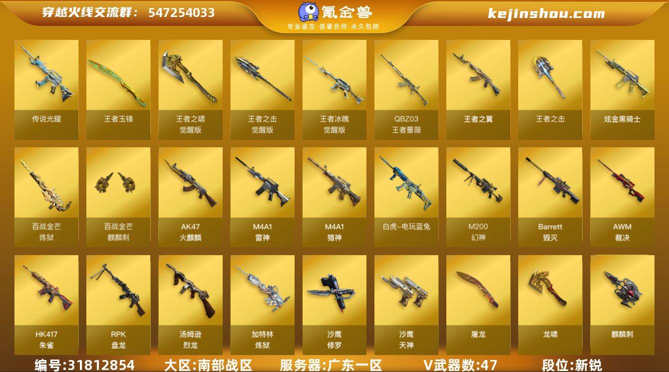 广东一区-51V-9王者武器数-1炫金武器数 【传说武器】:传说光耀 【热门武器】:传说光耀,HK417-朱雀*2,M200-幻神,QBZ-03-王者蔷薇,白虎-电玩蓝兔,汤姆逊-烈龙*6,RPK-盘龙*5,加特林-炼狱,斯泰尔-蝴蝶,沙鹰-修罗*5 【王者炫金武器】:王者之翼,QBZ-03-王者蔷薇,王者之击,王者玉锋,炫金骑士,王者之魄高爆手雷,王者之魄闪光弹 【音效卡】:M200-幻神音效卡,Barrett-毁灭音效卡,麒麟刺-百战金芒-盛典舞曲音效卡,白虎-盛典舞曲音效卡,炼狱-百战金芒-庆典舞曲音效卡 【皮肤】:雷神-虎将,雷神-耀金皮肤,M4A1-再燃火线,火麒麟-平天大圣,毁灭耀金皮肤,黑武士-典韦皮肤,战神-紫绶金章皮肤,AK47-B-常胜将军-刘备*3,AWM-天龙-传奇白鲨,炼狱-星空,屠龙-荣耀世冠AG,轻型军用手斧-再燃火线,擎天-冠军之击 【角色】:春,王者-瞳-闭月羞花,王者玲珑-小乔,葵-阿尔法武装,炽天使,初恋灵狐,芳心审判者,娟娟,灵狐者-七夕宝贝,灵狐者-职业经理,龙儿-小淘气,曼陀罗-X,曼陀罗-礼服,潘多拉-X,潜龙队-X,兔囡囡,海豹突击队 【人偶武器】:火麒麟-灵狐,斯泰尔-蝴蝶,迷你生化手雷,生化手雷-机甲核心,闪光弹-貂蝉,高爆手雷-大乔,迷你超能女侍 【暴走生化】:超级对讲机 【英雄级武器】:AK47-火麒麟,M4A1-雷神*2,HK417-朱雀*2,M4A1-猎神,AK-47-猩红传说,王者冰魄-觉醒版,AK47-B-常胜将军,白虎-电玩蓝兔,Barrett-毁灭,AWM-裁决,M200-幻神,RPK-盘龙*5,加特林-炼狱,炼狱-百战金芒,汤姆逊-烈龙*6,沙鹰-修罗*5,沙鹰-天神,屠龙,龙啸*2,擎天*2,麒麟刺,麒麟刺-百战金芒,王者之啸-觉醒版,王者之击-觉醒版,高爆手雷-幻灵,烟雾弹-玄豹 【道具】:BS战队炫彩背包,Q9战队炫彩背包,云山科技背包,炫彩背包,百战金芒炫彩背包,虎牙炫彩背包,超级背包,女皇终结者-魔龙之吻,...