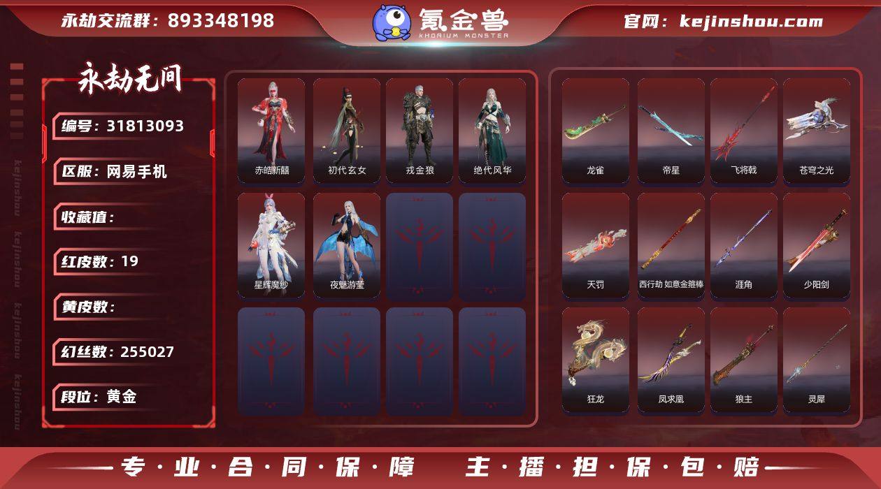 WJ4958,网易手机,网易支付无法注销,3月27日可换绑,三人段位黄金2,19红,666金,25万幻丝,声望10,御祥云,凶虎,炎烈珠,少阳剑,帝星,龙雀,狼主,飞将戟,涯角,灵犀,如意金箍棒,狂龙,凤求凰,天罚,苍穹之光,赤皓新囍,初代玄女,星辉魔纱,戎金狼,绝代风华,夜魅游莹,墨离,精武魂,无拘,至纯,过江龙,灵心,求真,椰风夕照,胧月魂,毛乎乎,鎏金勺,千钧羽,判官笔,撼龙,云朵咩咩,悠竹萌客,觉明尊者,鹅黄纱梦,李星云,金戈止,寒芷,击浪,福瑞天泽,极夜天曦,天虹咏,飞鼠,提步,逆天劫魂花,男性发型14,活动中心手机绑定无法解绑,