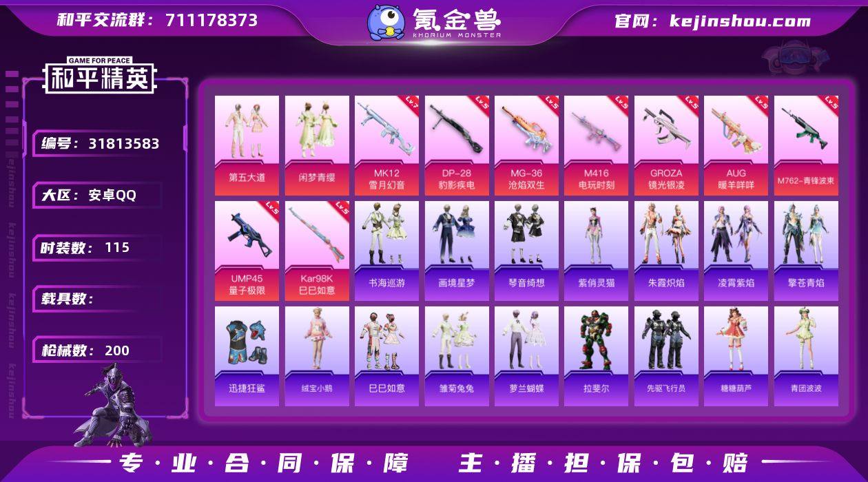 安卓 手Q-3粉装-11特效枪-0载具-3粉色飞行器-57179热力值-4王牌印记-115套装-200枪皮 【粉色套装】:粉装-第五大道,粉装-闲梦青缨,角色-罪夜之冕 【粉色枪皮等级】:M416-电玩时刻(五级),GROZA-镜光银凌(五级),AUG-暖羊咩咩(五级),M762-青锋波束(五级),UMP45-量子极限(五级),AKS-74U-森灵之息(五级),Kar98K-巳巳如意(五级),MK12-雪月幻音(七级),DP-28-豹影疾电(五级),MG-36-沧焰双生(五级) 【粉色枪皮】:M416-电玩时刻,GROZA-镜光银凌,AUG-暖羊咩咩,M762-青锋波束,UMP45-量子极限,AKS-74U-森灵之息,Kar98K-巳巳如意,Mk14-福马献瑞,MK12-雪月幻音,DP-28-豹影疾电,MG-36-沧焰双生 【粉色飞行器】:炫彩糖果飞行器,智趣喵喵飞行器 【粉色降落伞】:洛神天依降落伞,恐龙拽拽降落伞,萌物绒绒降落伞,炫光之旅降落伞,圣堂之誓降落伞,精灵梦叶罗丽降落伞,创世·救赎降落伞,金丰海韵降落伞,樱桃泡泡降落伞,幻彩电音降落伞,时光之誓降落伞,异瞳寒姬降落伞,炫彩糖果降落伞,霁蓝缠春降落伞 【稀有套装】:套装-绒宝小鹅,套装-巳巳如意,套装-雪国风尚,套装-炫彩糖果,套装-马上有钱,套装-雏菊兔兔,套装-萝兰蝴蝶,角色-拉斐尔,套装-先驱飞行员,套装-糖糖葫芦,套装-青团波波,套装-燕燕于飞,套装-鱼渊荷华,角色-风玲,套装-粉恋花,套装-紫幽梦,套装-蓝冰羽,套装-极速光影,套装-彩虹兔,套装-云朵鹅,套装-雪绒豹,角色-绛羽幽主,套装-朱霞炽焰,套装-凌霄紫焰,套装-擎苍青焰,角色-紫俏灵猫,套装-书海巡游,套装-画境星梦,套装-琴音绮想 【稀有枪皮】:AKM-破晓战魂,AKM-龙的传人,M16A4-幻世战舞者,SCAR-L-夜灯,SCAR-L-玉兔迎春,SCAR-L-红色方程式,M416-红色方程式,GROZA-异彩先驱,GROZA-影袭,AUG-耀粉歌者,QBZ-彩虹符号,QBZ-未来歌姬,QBZ-洛神天依,M762-天...