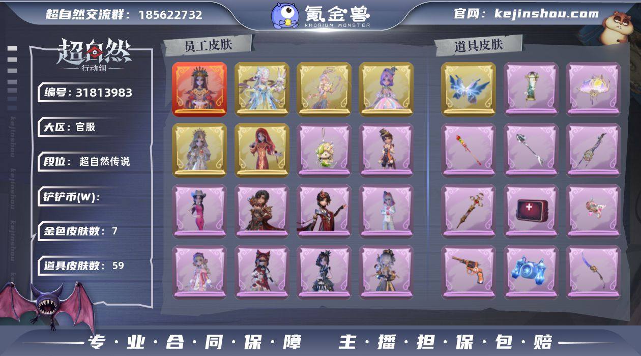 鬼玺大剑鉴定齐 生肖齐 一神龙十圣杯 三满柜大剑 三满柜鬼玺 一满柜种植雪莲裸资产3700w 卖了鬼玺能到7000w 庄园30 梦居全齐 昆仑梦居有维也纳阁楼 限定回收物除了年卡 都保留了9个 纯绿未开过挂 有视频可证明 红皮五零二170 薇薇安140出