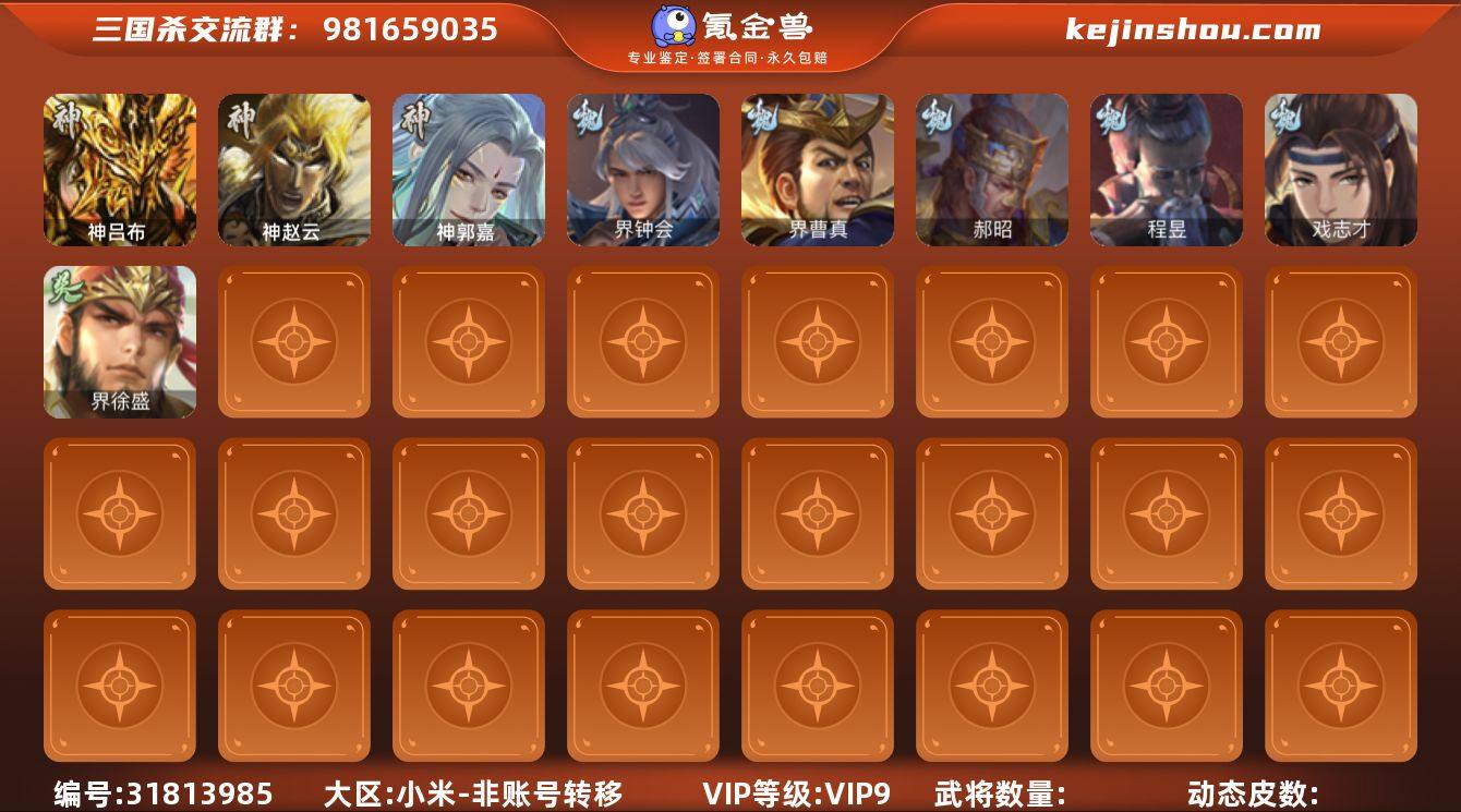 VIP等级: VIP9 官阶: 骠骑将军 武将数量: 270 动态皮肤数量: 19 神将: 神刘备,神吕布,神孙策,神赵云,神周瑜 魏国武将: 戏志才,曹纯,程昱,界曹真,界钟会,文鸯,唐咨-魏,徐庶,张辽,SP蔡文姬,SP关羽,SP贾诩,SP姜维,SP庞德,卞夫人,曹昂,曹操,曹冲,曹丕,曹仁,曹叡,王异,鲁芝,曹休,界曹植,满宠,荀攸,钟繇,郭嘉,牵招,荀彧,阮慧,界郭嘉,崔琰,界荀彧,朱灵,界王异,界许褚,陈群,袁涣,乐进,辛宪英,郭淮,郭皇后,夏侯惇,曹植,司马朗,谋于禁,界曹操,许褚,界张辽,谋徐晃,钟会,文聘,曹彰,界夏侯惇,诸葛诞,司马懿,甄姬,杨阜,徐晃,韩浩史涣,胡班,曹真,典韦,夏侯渊,李典,于禁,王双,邓艾,界司马懿,张春华,臧霸,朱灵(国战) 蜀国武将: 花鬘,界黄忠,谯周,张星彩,诸葛瞻,谋马超,谋黄月英,徐庶,杨仪,界关羽,界诸葛亮,邓芝,界伊籍,费祎,界黄月英,界张嶷,赵云,张松,彭羕,李丰,界刘备,刘封,谋庞统,黄月英,关羽,吴懿,吴班,祝融,张飞,黄皓,魏延,界周仓,马忠,界法正,刘禅,界赵云,张翼,关银屏,SP孙尚香,SP徐庶,卧龙诸葛,周仓,简雍,界关兴张苞,诸葛亮,界张飞,法正,界简雍,赵统赵广,界马岱,关平,马岱,界庞统,庞统,诸葛果,谋张飞,马谡,马超,廖化,关兴张苞,孟获,夏侯氏,姜维,黄忠,刘备,界马超,马良,蒋琬费祎,刘谌,彭羕(国战),甘夫人,蜀-糜芳傅士仁 吴国武将: 界徐盛,文鸯,周泰,全琮,吕蒙,诸葛恪,界孙尚香,大乔小乔,许贡,丁奉,谋吕蒙,孙茹,蒋钦,顾雍,阚泽,孙亮,孙休,严畯,界孙权,界凌统,祖茂,界吕蒙,陈武董袭,界孙策,凌操,朱治,孙尚香,程普,大乔,韩当,陆逊,诸葛瑾,朱然,太史慈,虞翻,界黄盖,孙鲁班,界周瑜,卫温诸葛直,孙权,鲁肃,界甘宁,吴国太,甘宁,界大乔,孙坚,孙鲁育,凌统,步练师,周瑜,小乔,潘璋马忠,黄盖,孙策,界陆逊,吴-唐咨,徐盛,张昭张纮,陈武蕫袭,吴-糜芳傅士仁,朱桓 群国武将: 界李儒,麹义,兀突骨,星黄忠,张让,伏完,刘协,华雄,董白,袁术,高顺,刘繇,...
