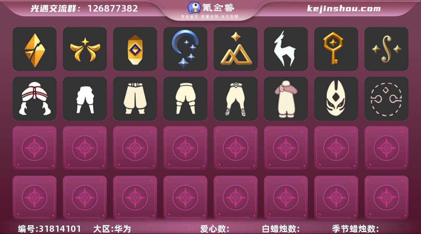 "亮点:6季白枭性价比多礼小号,彩虹武士裤,女巫裙,星月头冠,彩虹耳饰,彩虹耳机,圣诞鹿角,巫树犄角,彩虹帽,巫师帽,贝壳发饰,雪花发夹,玉兔发饰,小狗周年头饰,蓝色音乐会,创始人斗篷,星球夹克,欧若拉之翼,鲤跃龙门,蝙蝠斗,蛛网斗篷,暖冬瑞雪,白雪斗篷,绊爱礼包 区服:安卓官服 登录方式:邮箱 【毕业图】晨岛,云野,雨林,霞谷,暮土,禁阁 【毕业季】风行季,潜海季,表演季,小王子季,破晓季,欧若拉 【蜡烛】107【爱心】61【翼】188 【稀有礼包】彩虹武士裤,女巫裙,星月头冠,彩虹耳饰,彩虹耳机,圣诞鹿角,巫树犄角,彩虹帽,巫师帽,贝壳发饰,雪花发夹,玉兔发饰,小狗周年头饰,蓝色音乐会,创始人斗篷,星球夹克,欧若拉之翼,鲤跃龙门,蝙蝠斗,蛛网斗篷,暖冬瑞雪,白雪斗篷,绊爱礼包,夏日阳伞,情人秋千,花憩茶桌,冥龙南瓜,猫咪背饰,雪花水晶球,大橘大利,南瓜头,青衫落拓礼包,福娃礼包,年年有鱼礼包,皮皮猫套装 【毕业物品】多羽发饰,蓝黄羽袖,潜水面具,单边小辫,维京斗篷,帝企鹅发,黄眉企鹅面具,燕尾斗篷,双翼遥鲲斗,冥龙斗篷,留辫蘑菇头,高领舞服,透明蝶翼斗,小王子发型,小王子套装,玫瑰花 【热门复刻】武士裤,虚荣,正太头,猫猫头,背带裤,搓澡巾,花环长发,红耳机,箬笠,平顶帽,高音钢琴,白金斗篷,红金斗篷,黄鼠狼面具 【换绑cd】1.20"