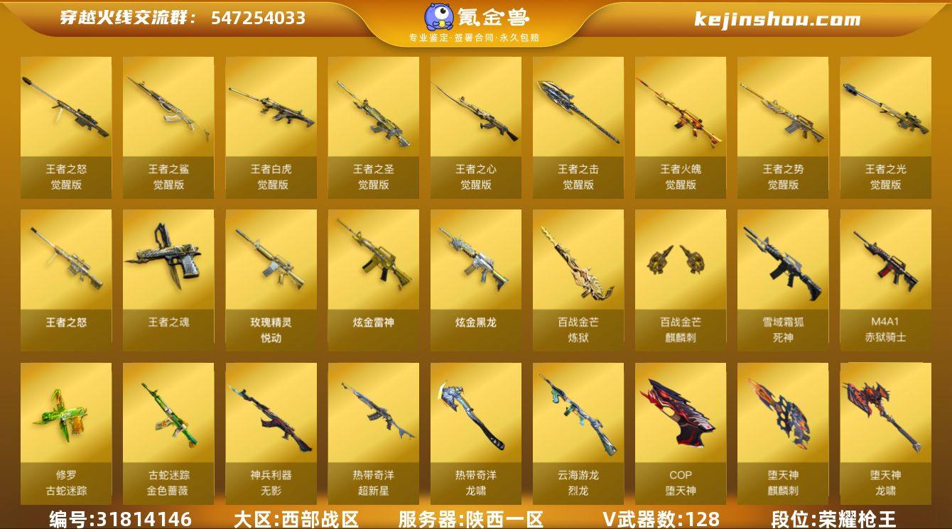 陕西一区-137V-13王者武器数-2炫金武器数 【热门武器】:QBZ03-金色蔷薇,金色蔷薇-古蛇迷踪,修罗-古蛇迷踪,M200-竞技荣光,死亡之眼,白虎-电玩蓝兔,M4A1-黑骑士*2,汤姆逊-烈龙*5,RPK-盘龙*6,加特林-炼狱*3,USP-雷暴,COP-堕天神*3,沙鹰-修罗*2 【王者炫金武器】:玫瑰精灵-悦动*2,王者之怒,王者之魂,炫金黑龙,炫金雷神 【音效卡】:M4A1-黑骑士音效卡*2,Barrett-毁灭音效卡*2,炼狱-百战金芒-庆典舞曲音效卡,死神-雪域霜狐-怀旧音效卡 【皮肤】:幻神-AG-CFPL S24冠军 皮肤,QBZ03-AG-CFPLS19冠军,AWM-裁决-凤灵皮肤,裁决-巅峰荣耀 皮肤,烈龙-星空,雷神-暗月,雷神-能量核心,雷神-虎将,雷神-机甲刑天皮肤,雷神-宇航兔皮肤,雷神-源计划2.0专属 皮肤,M4A1-再燃火线,火麒麟-AG战队皮肤,火麒麟-雷神*2,火麒麟-华夏之心,火麒麟-平天大圣,火麒麟-百城,毁灭-暗月,毁灭-星空*2,毁灭-战神张飞,毁灭-英雄计划 皮肤,M4A1-千变-孔明皮肤,黑骑士-暗月,黑骑士-破界 皮肤,无影-暗月,战神-粉色甜心皮肤,战神-紫绶金章皮肤,AK47-B-常胜将军-曹操*2,AK47-B-常胜将军-刘备,AK47-B-常胜将军-孙权*2,炼狱-玩具枪皮肤,修罗-CF STAR,修罗-能量核心*2,龙啸-蛇姬 皮肤,轻型军用手斧-再燃火线 【角色】:零,樱,迷迭香,电竞教官-云悠悠,王者之瞳,雪域霜狐,蛇隐宗,奇洋探员,云海玲珑,葵-阿尔法武装,暗夜-X,初恋灵狐,电竞少女,飞虎队-X,风暴女,嘉年华灵狐,0号玩家,灵狐者-七夕宝贝,龙儿,曼陀罗-礼服,潘多拉-甜心教官,潜龙队-X,青霞仙子,蛇姬,斯沃特-X,蜀雪,铁骑荣耀,兔囡囡,新娜塔莎,樱-战斗天使,影武者-X,游珑儿,职业选手 【人偶武器】:巴雷特-零-水下丽影,Scar Light-马枪,迷你深渊冰龙,迷你波特博士,迷你曼提柯尔,夺魂,迷你火种,生化手雷-机甲核心...
