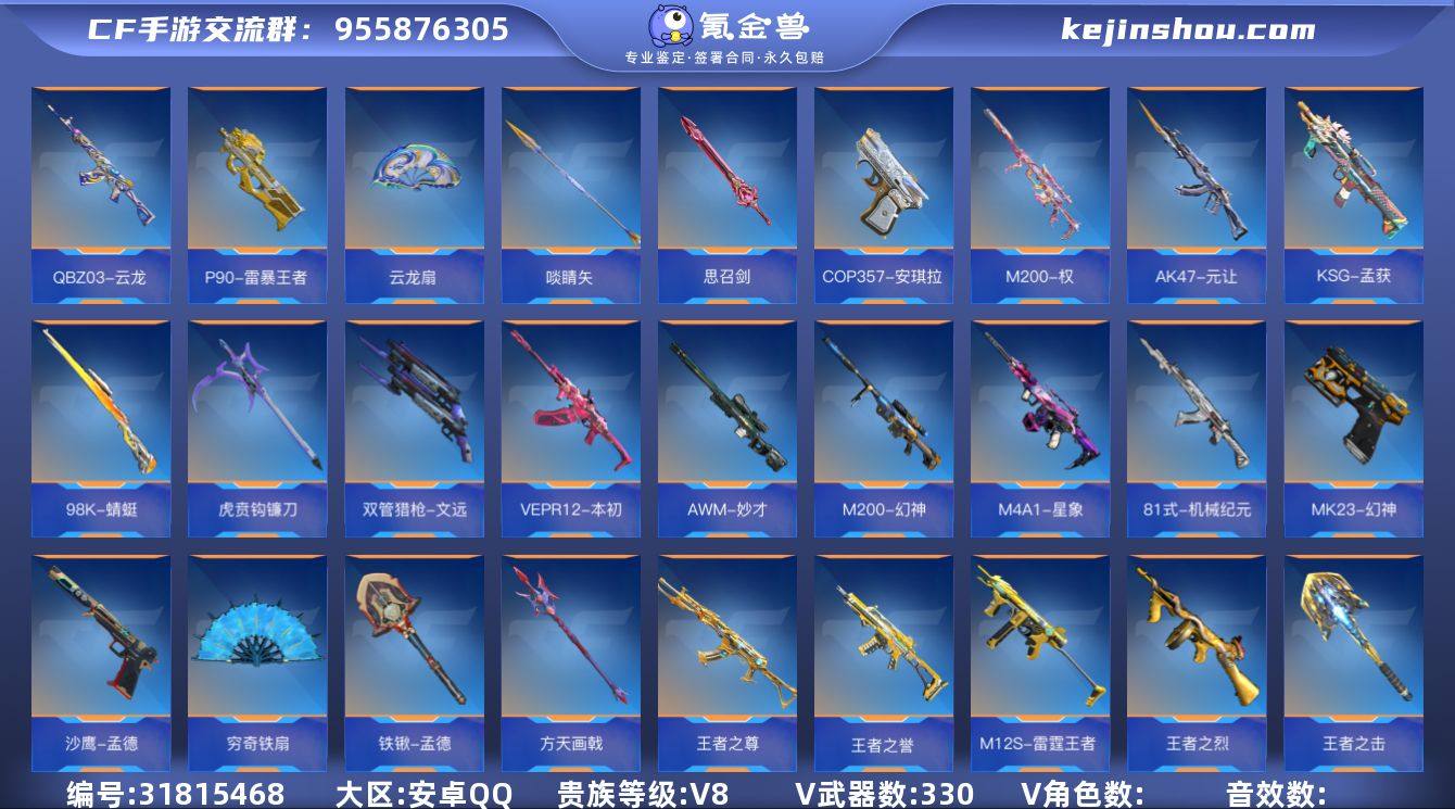 ✨精氪!一线至尊!多一线武器!3至尊2同框 41王者武器 3王者雷套 3COP 权(骇虎数字+熔岩枪线)王翎+火皮王势(熔岩光效+命中特效+数字+按键)火皮王心+拉丝王影+王锋+过载孟德+无双奉先+元让+星象+本初+烽火连城仲达+多三国+多套装+6屠龙+多万化✨『330V-显血戒-VIP8-146级』心至尊/翎至尊/兽至尊/ 【王者武器】:/王者之翎/王者之势-燃竞之巅/王者之心-燃竞之巅/王者之影-HeartShot/王者之尊/王者之兽/王者之誉/王者之狱-冰霜奇迹/P90-雷暴王者/王者之烈/王者之蝶/M12S-雷霆王者/王者之隐-冰霜奇迹/王者之魂-白金血钻/王者之业-冰霜奇迹/王者之仞-冰霜奇迹/王者之击/王者之锋/王兽雷套/王心雷套/王竞雷套/ 【热门武器】:/M200-权/AK47-孟德-过载/AK47-奉先-无双/AK47-元让/M4A1-星象/VEPR12-本初/M4A1-仲达-烽火连城/AWM-妙才/M200-幻神/81式-机械纪元/98K-蜻蜓/KSG-孟获/QBZ03-云龙/ 【副武器】:/COP357-云龙/COP357-安琪拉/COP357-冰川守护/双管猎枪-文远/MK23-幻神/沙鹰-孟德/ 【近战】:/雌雄双股剑-羸魔/穷奇铁扇/铁锹-孟德/虎贲钩镰刀/方天画戟/激昂霸王枪/思召剑/啖睛矢/云龙扇/屠龙*6/ 【角色】:/步练师/宋雨琦-X/ 【套装】(套装仅含主武器手枪近战):/孟德套/奉先套/本初套/元让套/云龙套/ 【其他】:/9音效卡(心+云龙)/4消灭音效/狙击枪线(熔岩+遁天梭)/ 截图展示段位不代表实际段位 如赛季更新等不可抗拒因素发生变化、时限道具不保证所剩时间