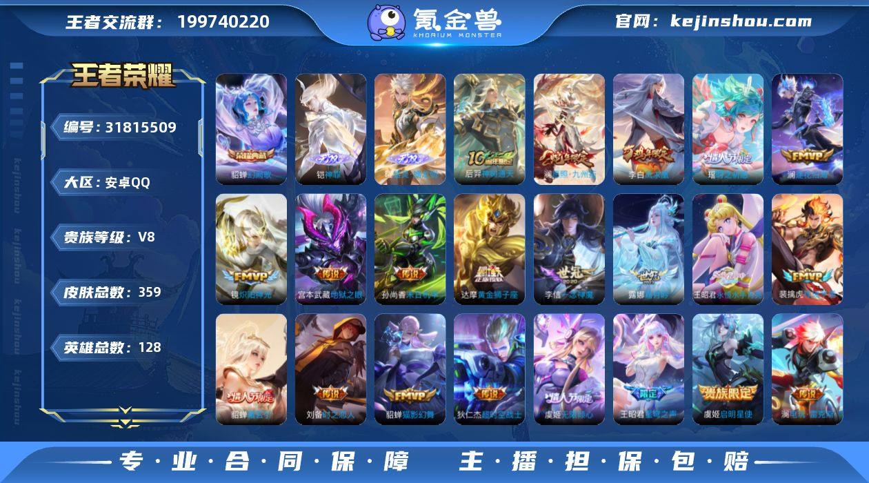 KF18267【4省标/万战刘备/大司命/狂铁/暃 5市标 3星传/幽冥之眼/星际治安官/未来机甲 22按键 】实名: 可修改 贵族等级: V8 英雄数: 128 皮肤数: 359 荣耀水晶: 幻阙歌 无双皮: 器灵·螭龙剑,神罪 传说皮: 黄金狮子座,猫影幻舞,炽阳神光,一念神魔,末日机甲-孙尚香,地狱之眼,时之恋人-刘备,超时空战士-狄仁杰,电玩·雷克斯,永恒水手月亮,霜月吟,澜逐花归海,貂蝉曦玄引,祥瑞亨通,神树通天 限定皮: 冰锋战神,遇见飞天,李小龙,游园惊梦,梁祝,神威,冰霜恋舞曲,天狼绘梦者,凤求凰,至尊宝,如梦令-后羿,大圣娶亲,默契交锋-花木兰,高山流水,时之祈愿-瑶,星穹之声,五谷丰年,山海·玄木吟,无限倾心-虞姬,愿照·九州拓