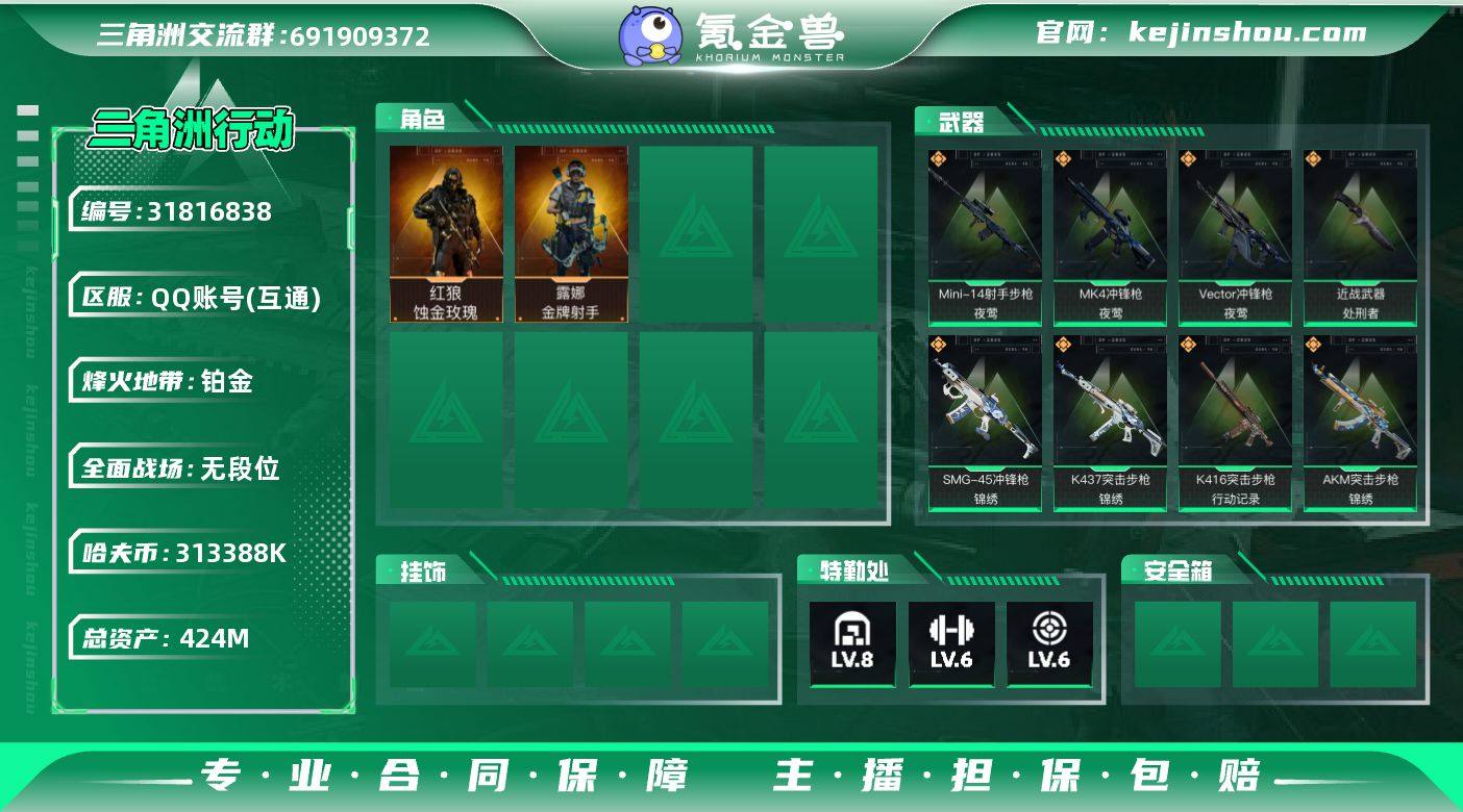 【LX38634】【总资产:424m,流动资产:389.3m-1干员红皮:红狼 蚀金玫瑰-刀皮:处刑者】 60烽火等级-铂金-2战场等级-无军衔 【干员外观】:红狼-蚀金玫瑰,露娜-金牌射手 【近战皮肤】:近战-处刑者,近战-黑鹰 【传说外观】:M4A1突击步枪-蚀金玫瑰,AKM突击步枪-锦绣,K416突击步枪-行动记录,SG552突击步枪-运动员,SCAR-H战斗步枪-荼蘼,K437突击步枪-锦绣,Vector冲锋枪-夜莺,SMG-45冲锋枪-锦绣,SR-3M紧凑突击步枪-荼蘼,MK4冲锋枪-夜莺,PKM通用机枪-荼蘼,Mini-14射手步枪-夜莺,M14射手步枪-蛮荒 【史诗外观】:K416突击步枪-冬日风情,K416突击步枪-腊梅,M7战斗步枪-百步穿杨,SG552突击步枪-哈夫克警备,G3战斗步枪-流沙送葬,G3战斗步枪-哈夫克警备,AS Val突击步枪-百步穿杨,MP5冲锋枪-深海恐惧,Vector冲锋枪-百步穿杨,SMG-45冲锋枪-阿萨拉特攻,MP7冲锋枪-六套之力,S12K霰弹枪-曙光,M249轻机枪-丛影谍踪,QJB201轻机枪-炽焰,VSS射手步枪-丛影谍踪,M14射手步枪-工业狂潮,M700狙击步枪-百步穿杨,M700狙击步枪-哈夫克警备,AWM狙击步枪-流沙送葬 【稀有外观】:M4A1突击步枪-繁盛,AKM突击步枪-肃杀,ASh-12战斗步枪-繁盛,K416突击步枪-一帆风顺,SG552突击步枪-2026,SG552突击步枪-马年新春,SG552突击步枪-贴花艺术,SCAR-H战斗步枪-荣耀列队,G3战斗步枪-主宰,CAR-15突击步枪-来财,KC17突击步枪-来财,MP5冲锋枪-弄臣,UZI冲锋枪-精英联盟,野牛冲锋枪-精英联盟,SMG-45-行动开启,SMG-45冲锋枪-幻影结构,SR-3M紧凑突击步枪-马年新春,勇士冲锋枪-主宰,勇士冲锋枪-冰天雪地,M1014霰弹枪-幻影结构,M249轻机枪-毛鲁斯之力,M249轻机枪-冰天雪地,QJB201轻机枪-哈夫克卫队,Mini-14射手步枪-荣耀列队,SKS射手步枪-弄臣,PSG-1射手步枪-主宰,G18-星链科技,G18-哈夫克航天...