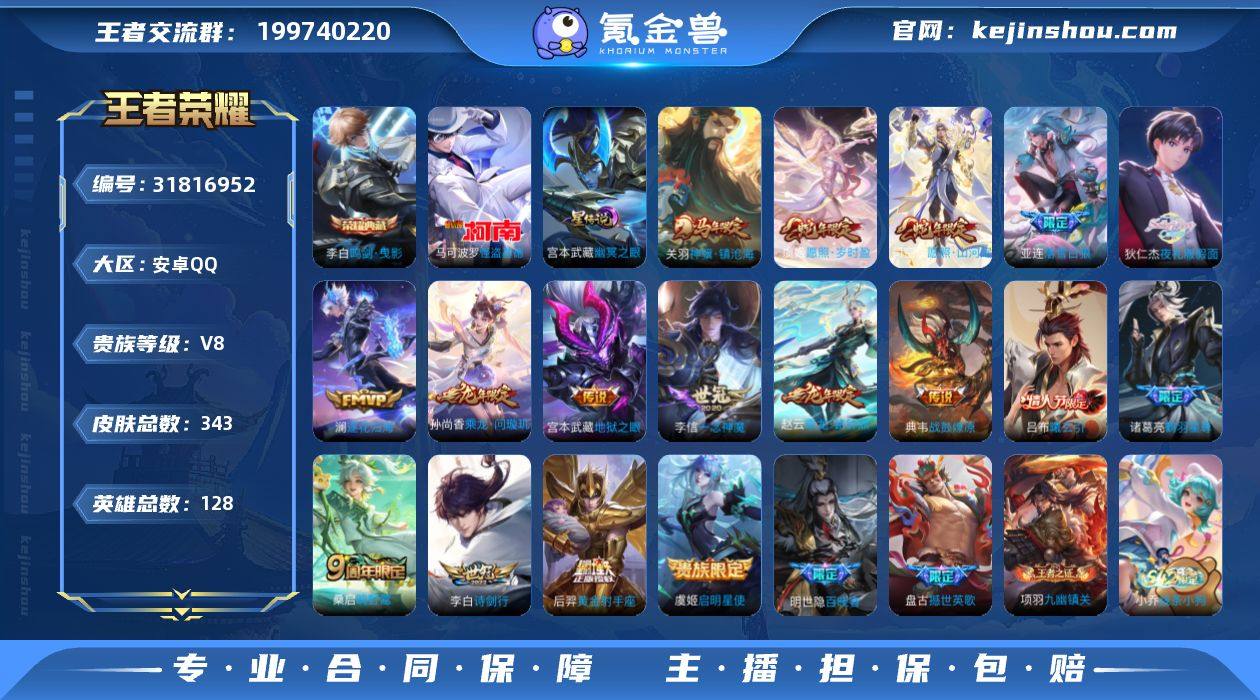 安卓手Q365区343皮1典藏17传说0无双1珍品传说V8 营地ID1883646109最强王者【珍品传说皮肤】:怪盗基德【荣耀典藏】:鸣剑·曳影【优质限定皮肤】:神骥·镇沧海,至尊宝,神威【传说皮肤】:神骥·镇沧海,黄金射手座,地狱之眼,落雪白狼,启明星使,愿照·山河定,愿照·岁时盈,鸣野蒿,一念神魔,乘龙·铭钟鼎,曦玄引,乘龙·问璇玑,战鼓燎原,诗剑行,逐花归海,夜礼服假面,鹤羽星尊【史诗皮肤】:百晓客,修罗,撼世英歌,线条小狗,灵蛊蚀心,九幽镇关,逐浪之夏,胡桃异想国,暗夜贵公子,顽趣,乘龙·聚宝船,冰冠公主,巫礼祀神,晚萤,游园惊梦,群星魔术团,光弋星穹,猫狗日记,涂山容容,节奏热浪,百相守梦,东方月初,百相守梦,末日机甲,箭羽风息,鸭鸭历险记,雪豹·霜爪,龙之律动,化蝶舞,乐园奇幻夜,狼魂孤将,特工魅影,茶境仙,器灵·浮梦炉,水晶猎龙者,优雅恋人,黄金分割率,星界战将,地狱岩魂,天秀·启明,百相守梦,星界特工,李小龙,功夫厨神,幽灵船长,绅士熊喵,银河之约,原初追逐者,破空之剑,天才门将,至尊宝,乱世虎臣,夏日便利店,女仆咖啡,心灵战警,青焰无极,浮光幕影,鬼剑武藏,怒海争锋,暗渊魔法,星夜王子,蔬乡物语,圣诞狂欢,无限星赏官,乘风破浪,暗隐猎兽者,永昼,琥珀纪元,燃音魔法,圣诞恋歌,荣光圣徽,雪夜绮愿,拒霜思,百解令,曙光守护者,地狱燃心,紫霞仙子,冰雪圆舞曲,江河有灵,未来纪元,驭风魔法,鹰眼统帅,电玩·爆裂旋风,魔术师,赏金猎手,奇幻香踪,唤灵魅影,百相守梦,皇家上将,星界游侠,缤纷独角兽,猫狗日记,无心,水果甜心,五谷丰年,傲雪梅枪,金属风暴,神威,孙行者