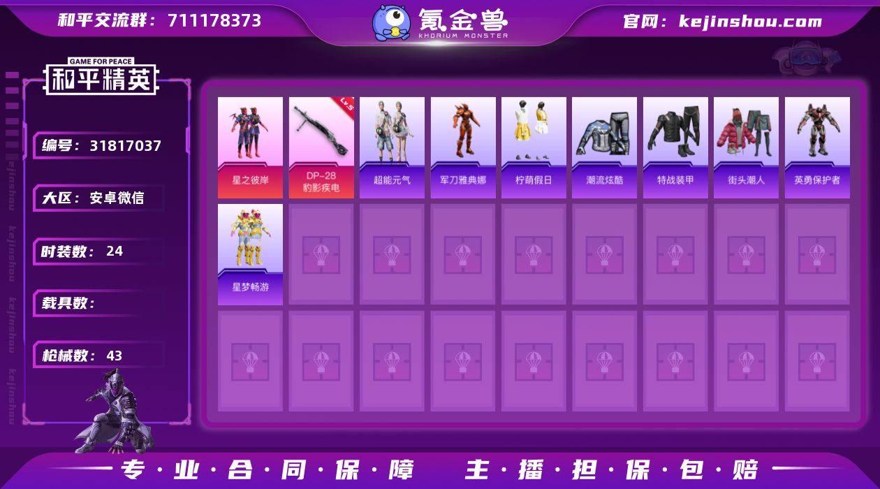 安卓 微信-1粉装-2特效枪-0载具-1粉色飞行器-11079热力值-1王牌印记-24套装-43枪皮 【热门品类】:角色-军刀雅典娜 【粉色套装】:粉装-星之彼岸 【粉色枪皮等级】:Mk14-福马献瑞(五级),DP-28-豹影疾电(五级) 【粉色枪皮】:Mk14-福马献瑞,DP-28-豹影疾电 【粉色飞行器】:炫彩糖果飞行器 【粉色降落伞】:绝对恒星降落伞,环太平洋降落伞,炫彩糖果降落伞,虎痴许褚降落伞 【稀有套装】:套装-超能元气,套装-雪国风尚,套装-炫彩糖果,套装-马上来财,套装-雨过天青,套装-红釉青花 【稀有枪皮】:AUG-冰晶雪宝,AKM-星之彼岸,AKM-环太平洋,AKM-破晓战魂,M16A4-幻世战舞者,M762-登顶巅峰,汤姆逊-天降萌叽,汤姆逊-环太平洋,M24-炫彩节奏,VSS-星之彼岸,M249-星之彼岸,MG3-幻世战舞者 【其他套装】:套装-柠萌假日,套装-潮流炫酷,套装-特战装甲,套装-街头潮人,角色-英勇保护者,套装-星梦畅游 【营地ID】:1026994898