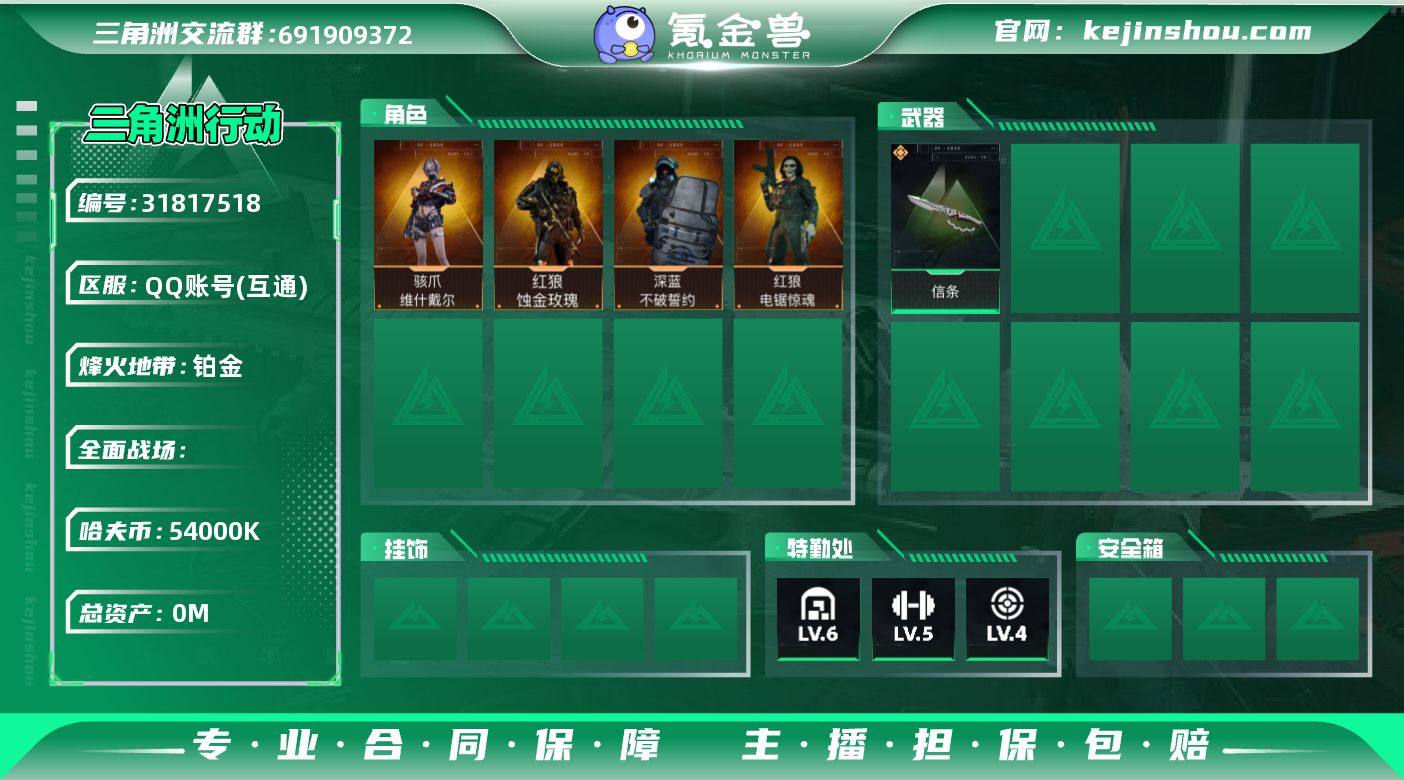 1205三端互通qq/资产88M/烽火等级60/刀皮信条套+红狼蚀金玫瑰+维什戴尔+不破誓约+电锯惊魂/特勤可以/纯币54000k+大红刘涛+比利的面具狼/附带无畏契约2025全球冠军套