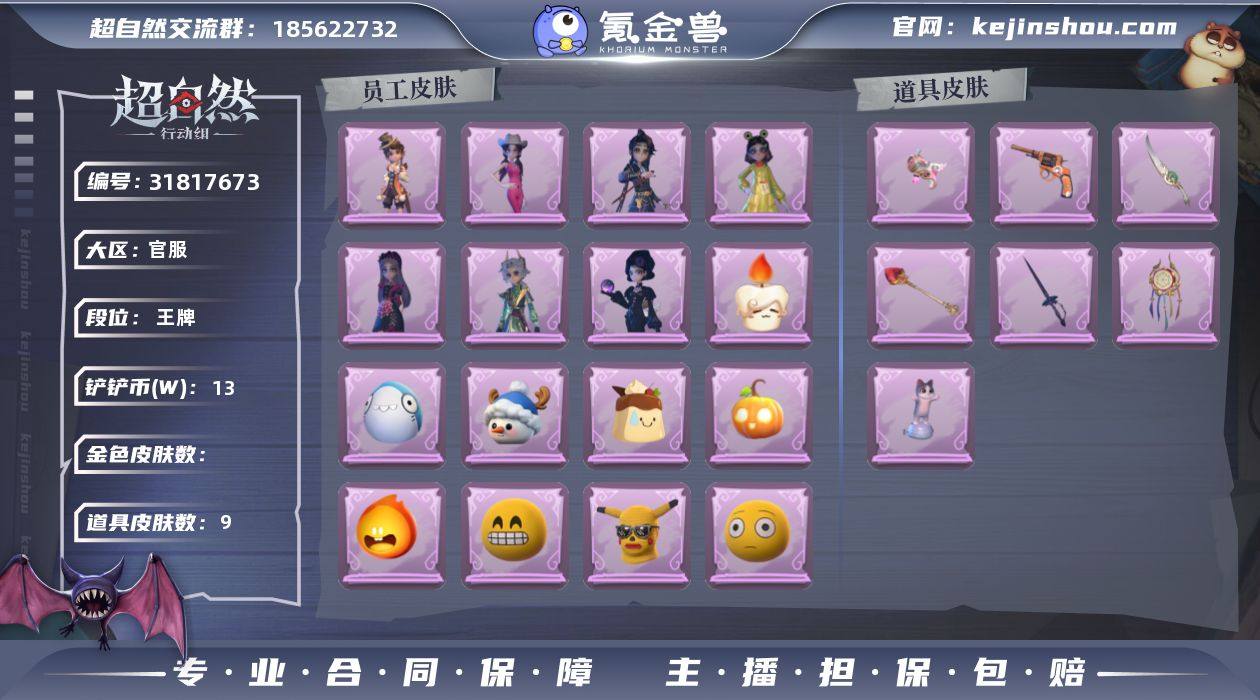 156紫色皮肤数量: 7 道具皮肤数量: 9 段位: 王牌 员工: 逍遥,薇薇安,巫铃儿,莉莉,阿念,艾伦,小黄,零,爱丽丝,爱德华,兰,小满,临云 外观: 丝缕哀歌,泽引山海,黑月挽歌,嘻嘻头套,烈焰红唇头套,呆滞头套,卑微头套,哈士奇头套,滑稽头套,鳄霸天头套,鱼头怪头套,面具马头套,萨卡班甲鱼头套,小狗蛇点点头套,小鲨包包,天使消失的年代,呱呱雨衣,绣春逍影,火爆了头套,惊魂南瓜,樱桃奶油布丁,雪墩墩头套,太空鲨头套,尘封旧事,耀眼的你,庆宴绮愿,烛光纪念,不朽的今夜,牛啤背包