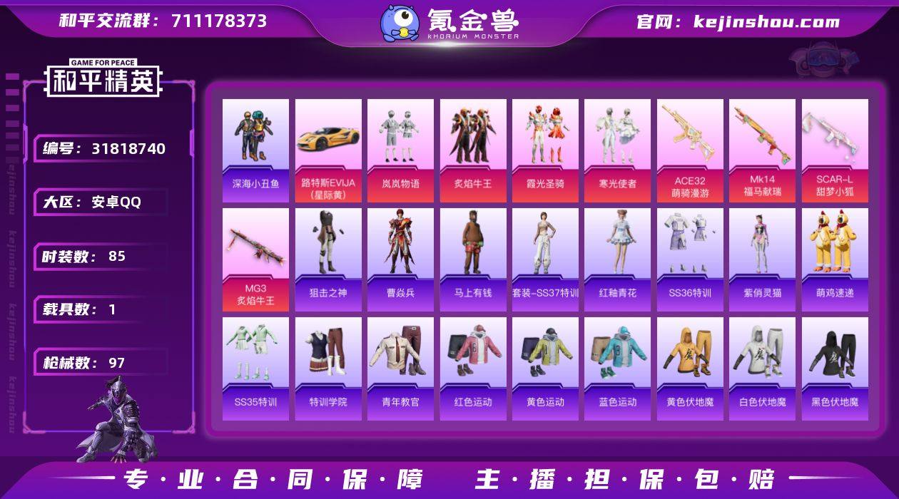 【1载具 4特效枪 4粉装 97枪皮 85套装】2印记/3.2万热力值/42级收藏家/有鲨鱼裤/套装-深海小丑鱼,套装-岚岚物语,套装-炙焰牛王,套装-霞光圣骑,套装-寒光使者/4升级枪:SCAR-L-甜梦小狐,ACE32-萌骑漫游,Mk14-福马献瑞,MG3-炙焰牛王/1载具:路特斯EVIJA(星际黄)/2飞行器:马上有福飞行器,云朵驼驼飞行器173529502x,编号:LYGIN47